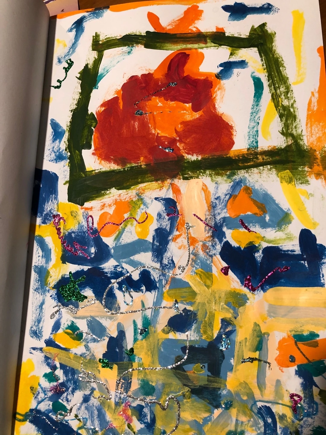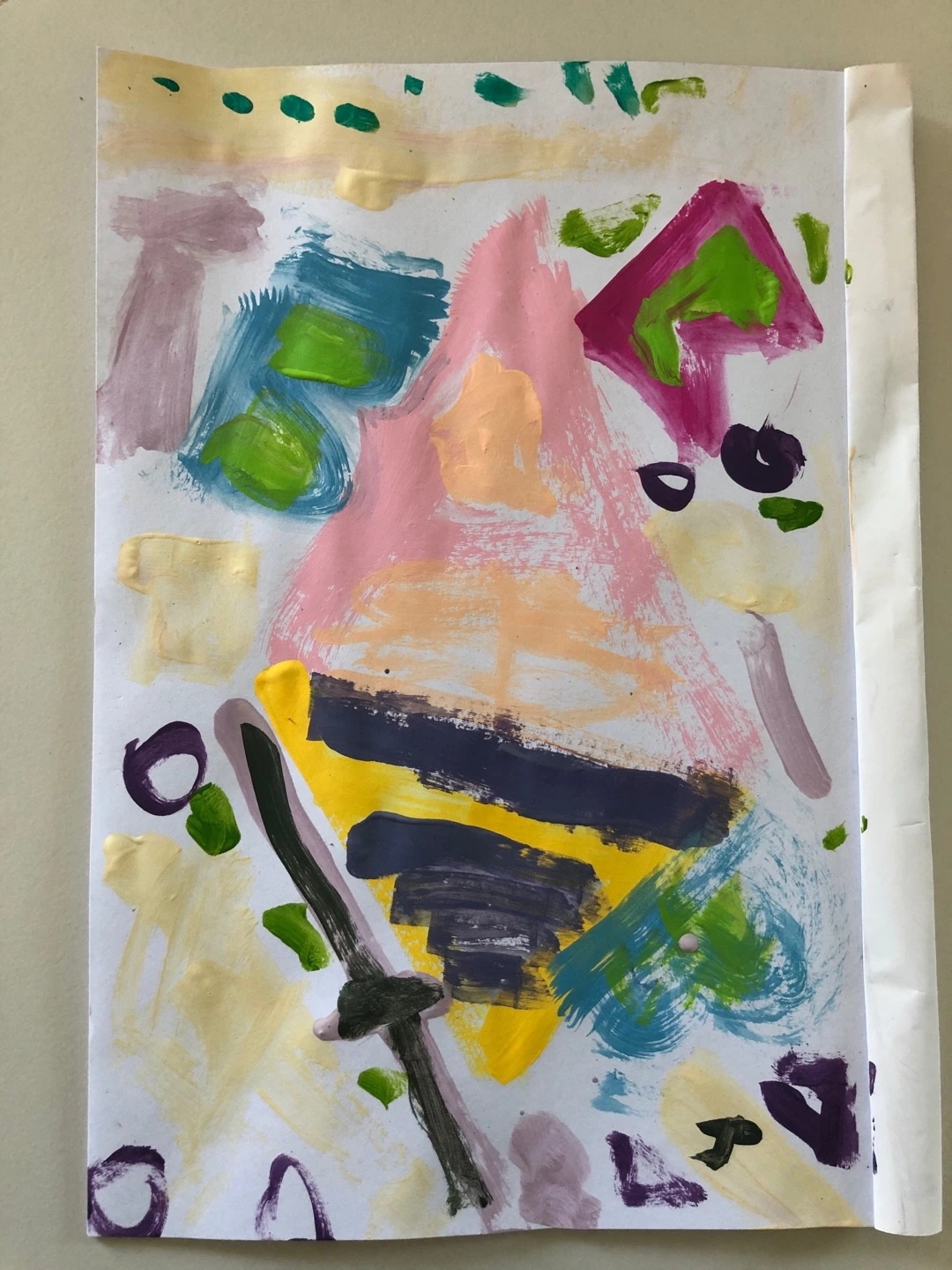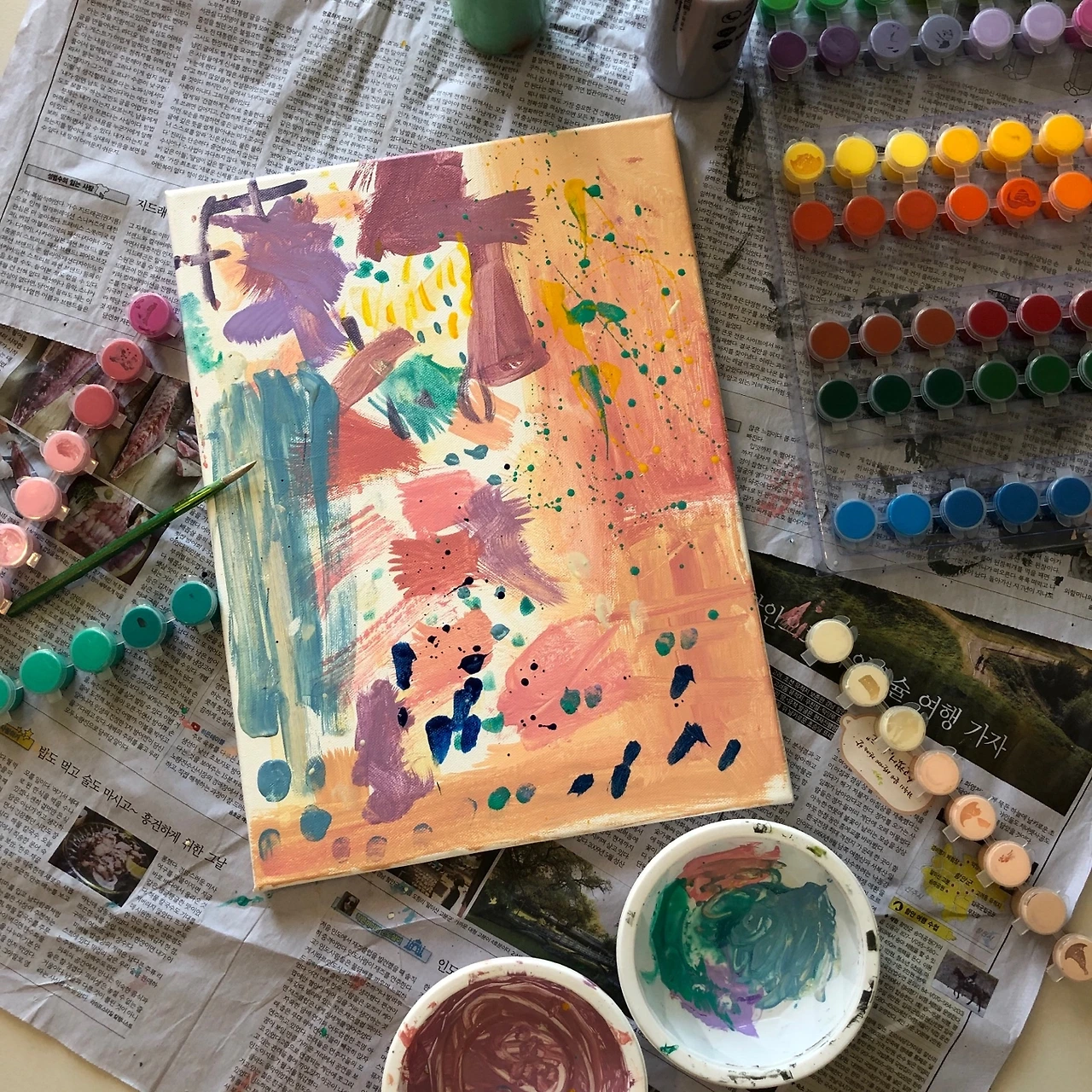 물감을 뿌리기도 하고, 넓은 붓을 사용하기도, 점을 찍기도, 나중에는 지문으로 찍기도 하면서 다양하게 그림을 그리는 모습이 너무 귀여웠다. 결국 완성한 작품에 제이는 '비 내리는 추상화'라는 제목을 붙여주었다. 제이의 첫 아크릴화 작품, 소중하게 간직해야지.