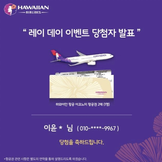 방법은 너무 간단했는데, 맘에 드는 레이를 고른 뒤 게시물에 좋아요 와 댓글, 그리고 공유하는 거였어. 너무 쉬워서 1등 당첨은 생각도 안 하고 있었지. 1등 상품이 뭐였냐고? 하와이안항공 항공권 2 매였어.