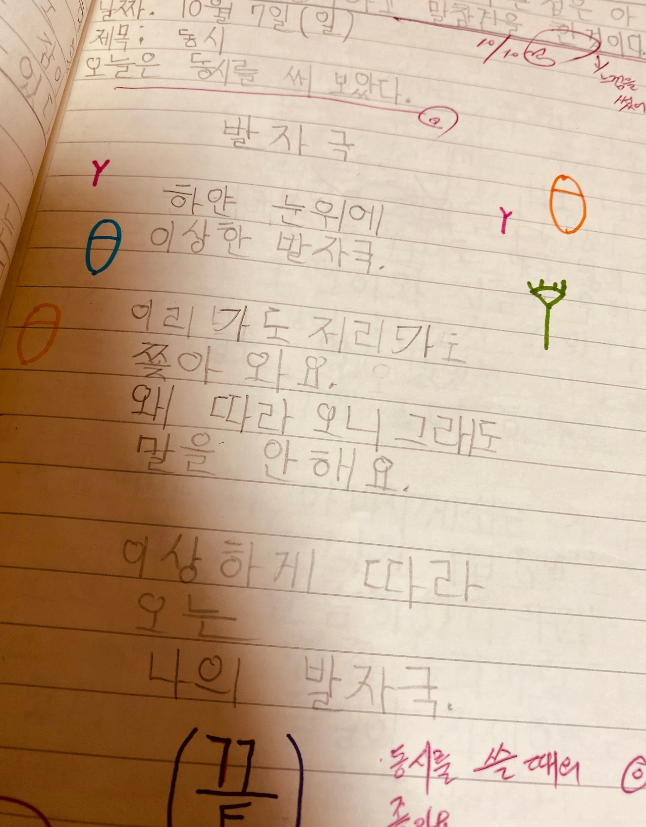 몇 년 전, 책장을 정리하다 우연히 예전 일기장을 찾았다. 반가운 마음에 읽다 보니 ‘동시’를 쓴 페이지가 나왔는데 첫 문장은 늘 이렇게 시작됐다. ‘오늘은 동시를 써 보았습니다.’