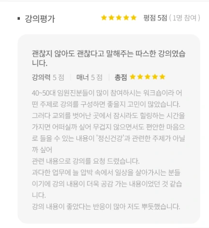 "어떤 주제의 강의든 이론으로만 끝나지 않고 교육생분들께 조금이라도 실제적으로 도움이 되는 내용을 소개하고, 교육 중, 나아가 교육 이후에도 실생활에서 적용해보실 수 있도록 구체적이고 실천 가능한 방법을 알려드리는 것이 중요하다."