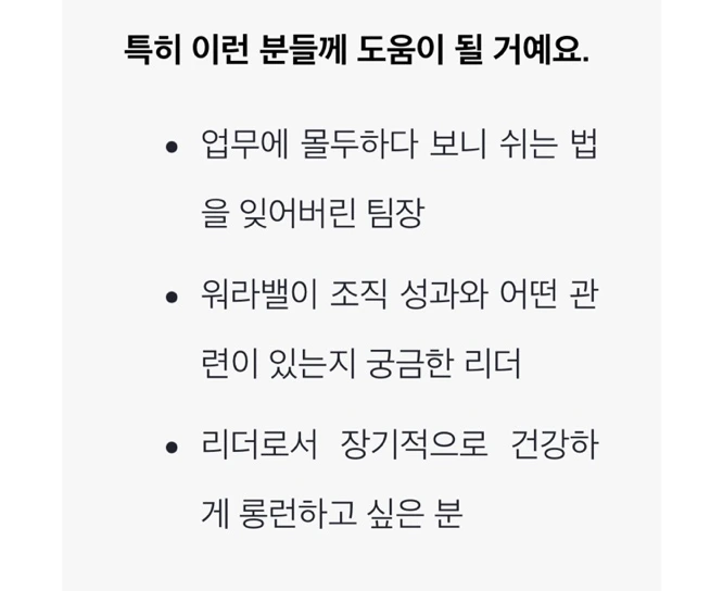그리고, 잘 일하는 것만큼이나 잘 쉬는 것이 중요하다는 사실을 기억하시고, 일상에서 쉼을 실천하실 수 있기를 응원합니다 :)