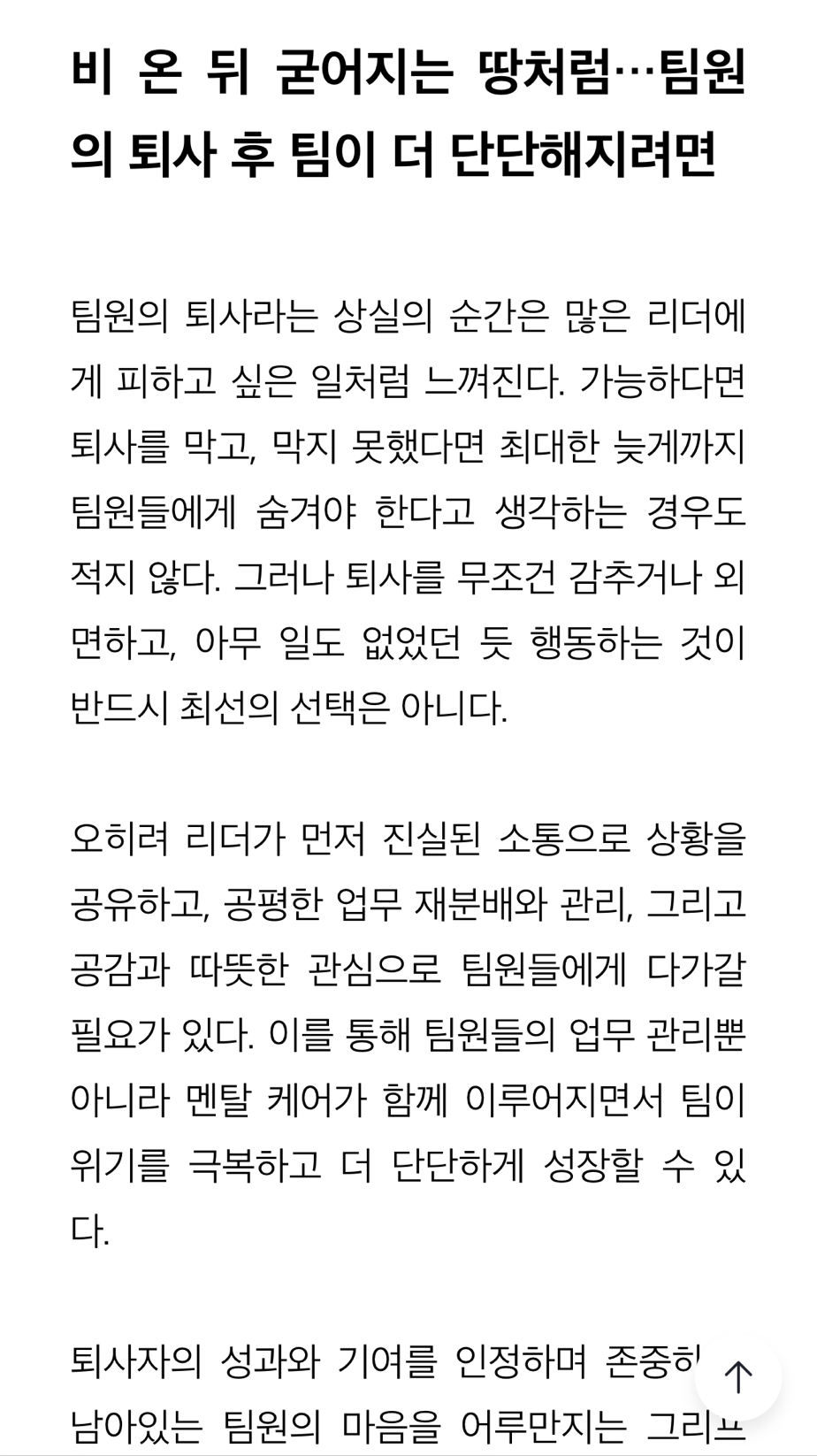 그렇다면 이런 상황에서 남겨진 팀원들의 멘탈과 업무관리를 잘하고, 팀을 효과적으로 이끌기 위해 팀장은 어떻게 해야 할까요?
