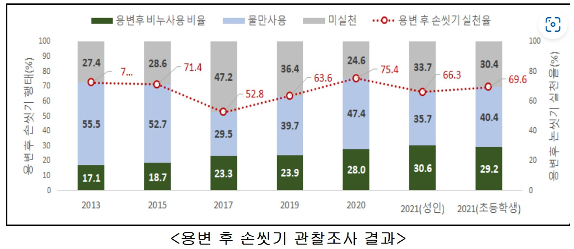 질병관리청에서 '용변 후 손 씻기 추이'와 관련된 실태조사를 전국 1,248개 공중화장실과 성인 2,353명, 초등학생 1,056명을 대상으로 실시했다.