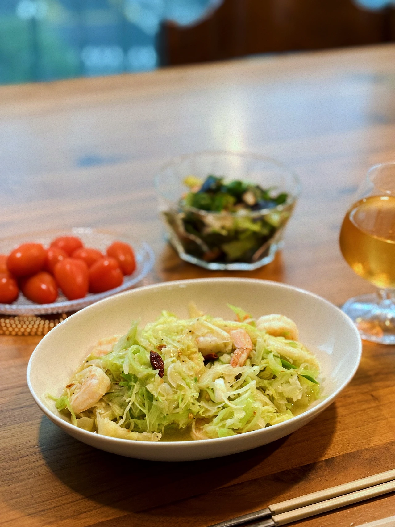 *재료: 채 썬 양배추 한 줌, 대파채, 새우, 편마늘이나 다진 마늘, 페퍼론치노, 소금, 후추, 치킨스톡(혹은 참치액이나 굴소스)
