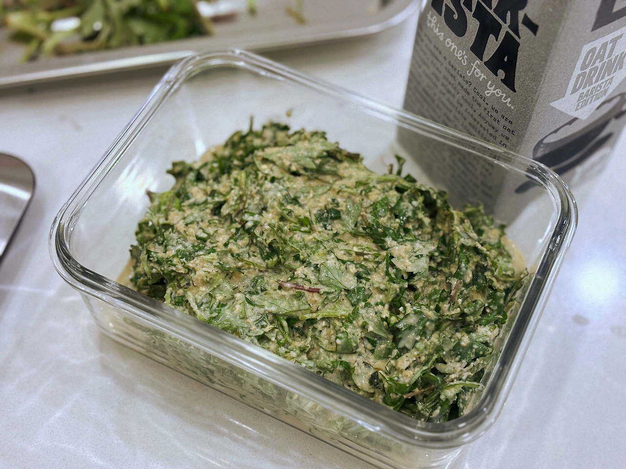 - 두유(우유, 오트밀크 등) 190ml 부어 섞는다