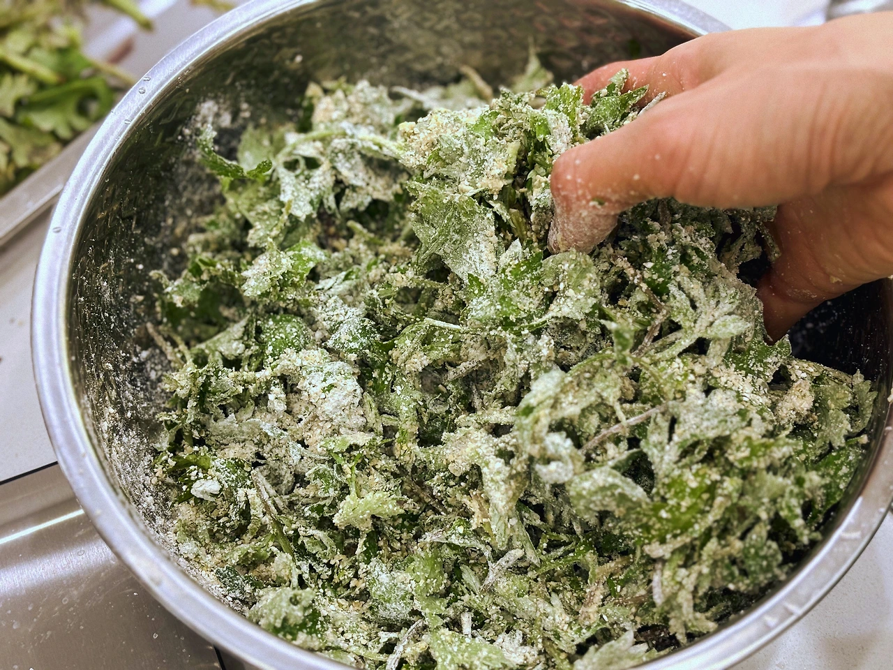 - 쑥 80g과 위의 가루를 살살 버무려 섞는다