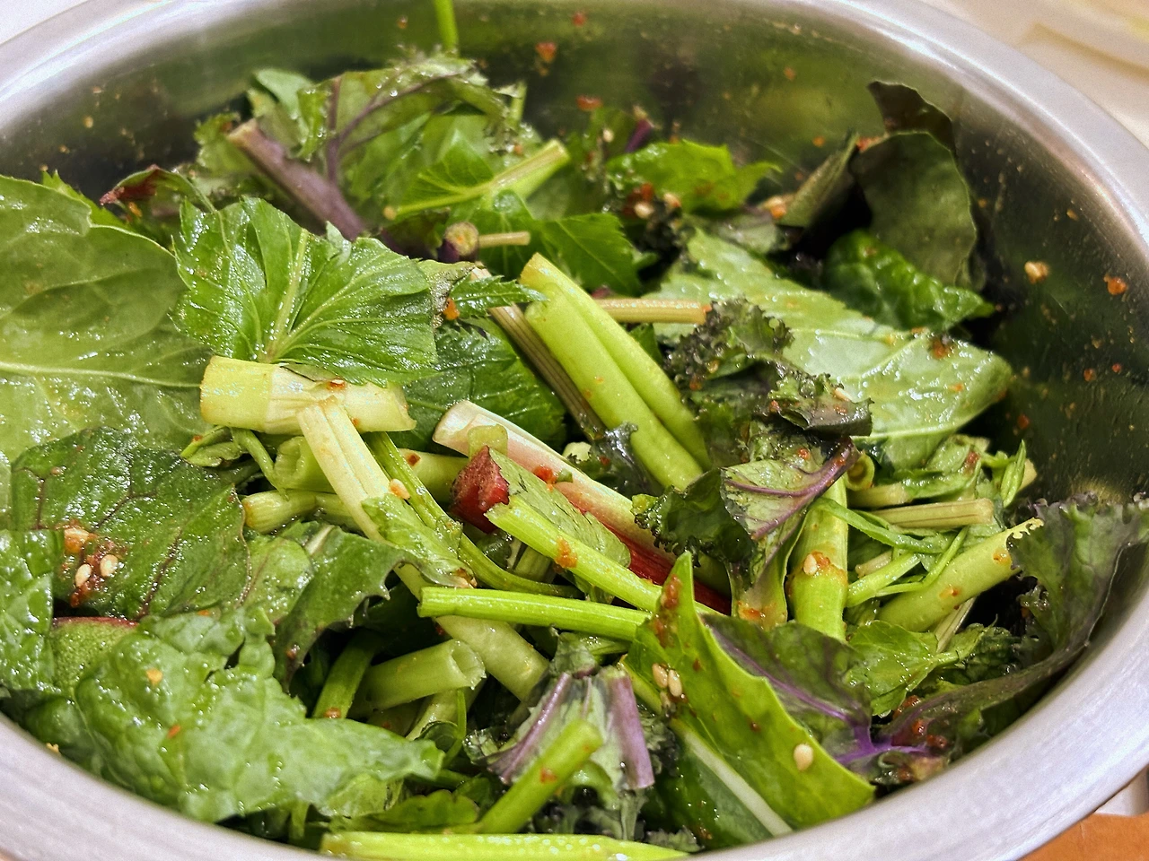 샐러드라기보다는 무침이었던 매콤소스와 채소의 조합. 한식 식사에 곁들이기 좋은 조합이다. 미나리에 찰떡이지만 다른 채소에 버무려도 맛있을 새콤달달 소스이다.