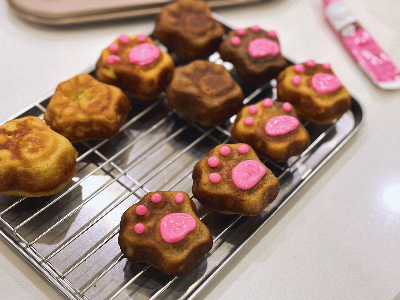 고양이를 좋아하는 딸을 위해 고양이 발모양 틀에 굽고 초코펜으로 꾸며보았다. 플레인, 딸기, 초코 세 가지 반죽으로 해보았는데 구워놓으니 다 비슷해 보인다. 사실 맛도 크게 다르지는 않다.