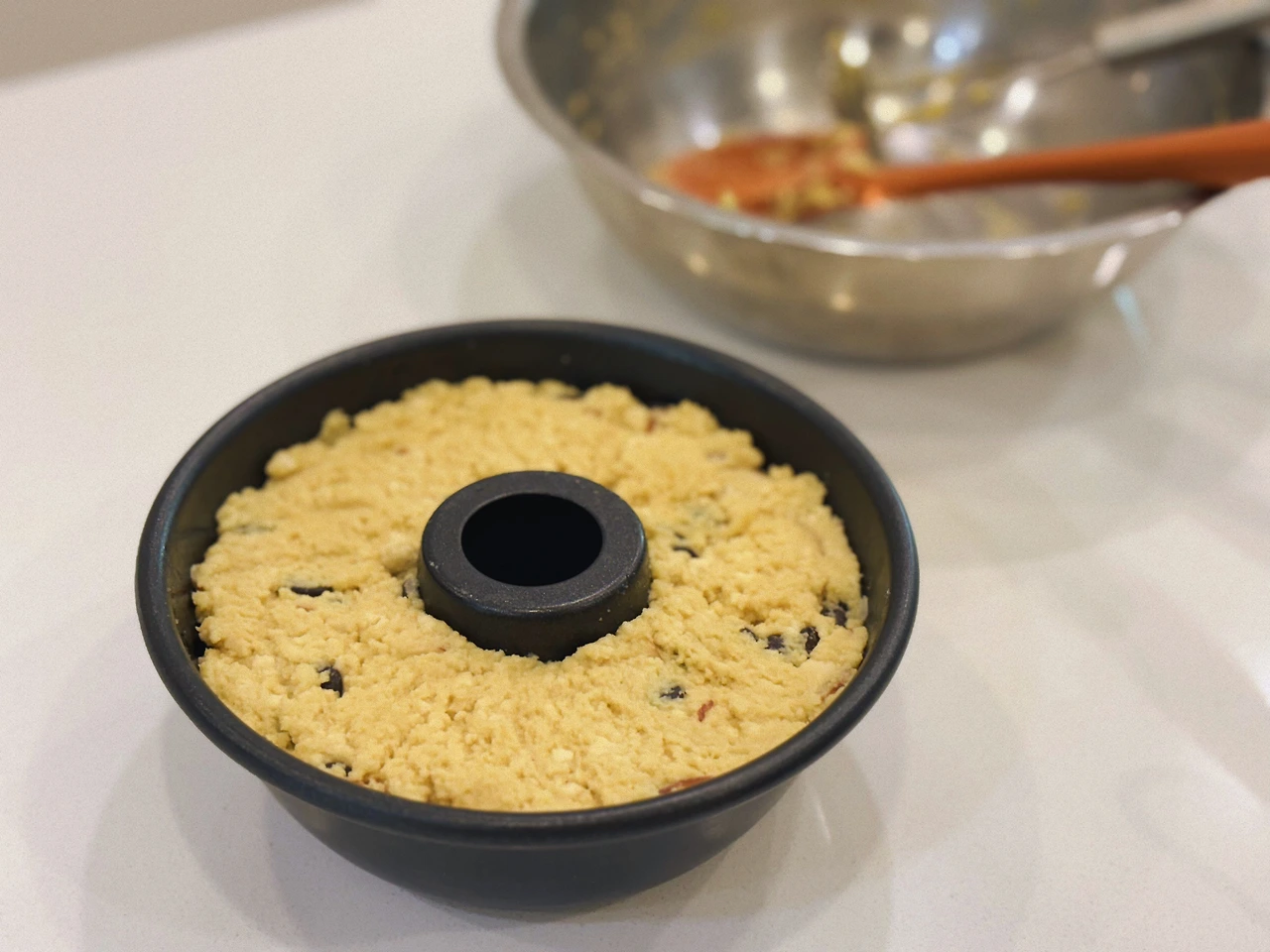 - 케이크 틀에 올리브오일을 살짝 발라주고 반죽을 넣어준다
