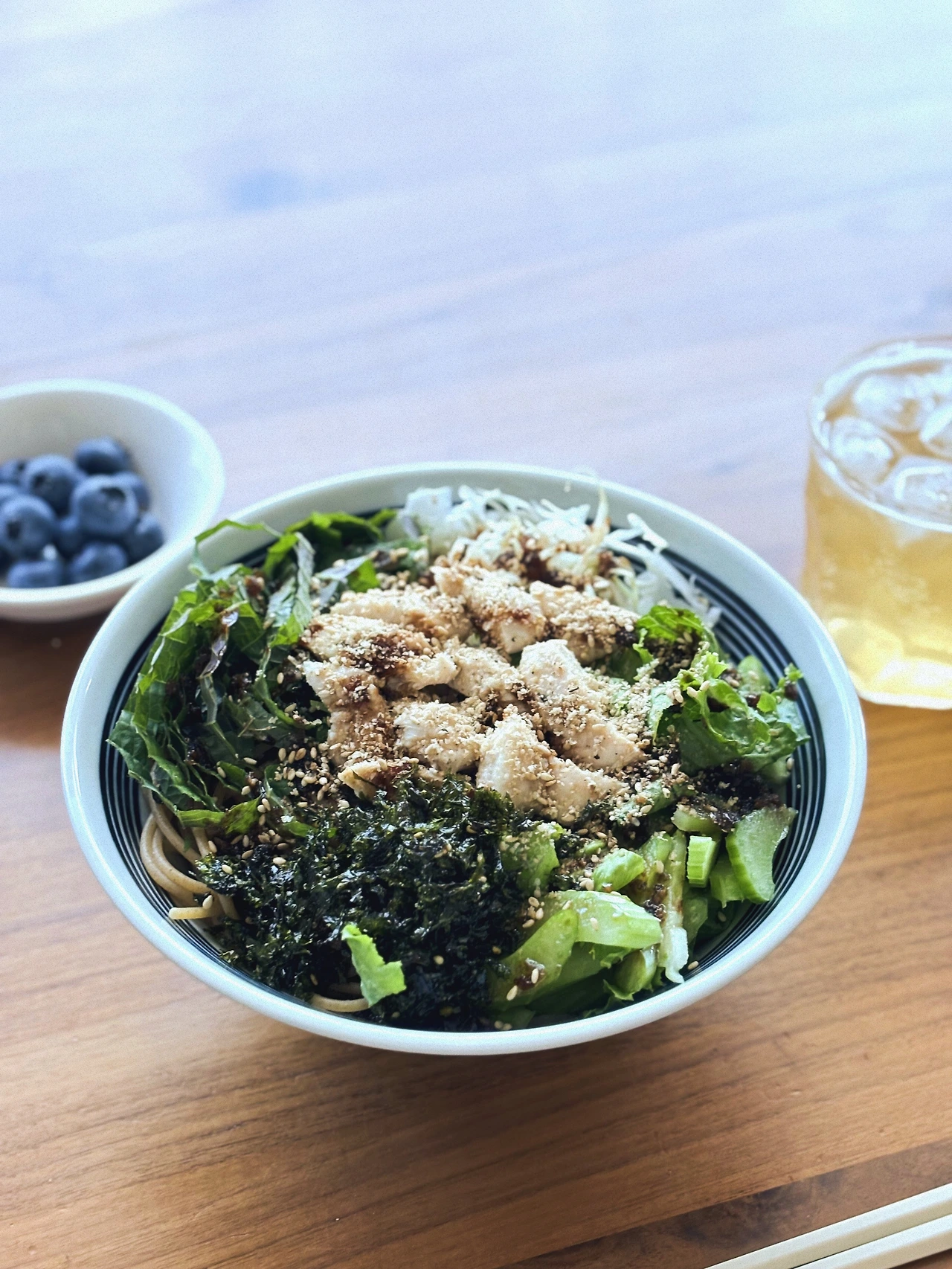*재료: 파스타면 1인분, 닭안심(원하는 육류 가능. 없어도 괜찮음), 샐러드 채소, 다진 마늘 1T, 간장 2T, 알룰로스 1T, 참기름 1T, 깨(갈아도 좋음), 김가루