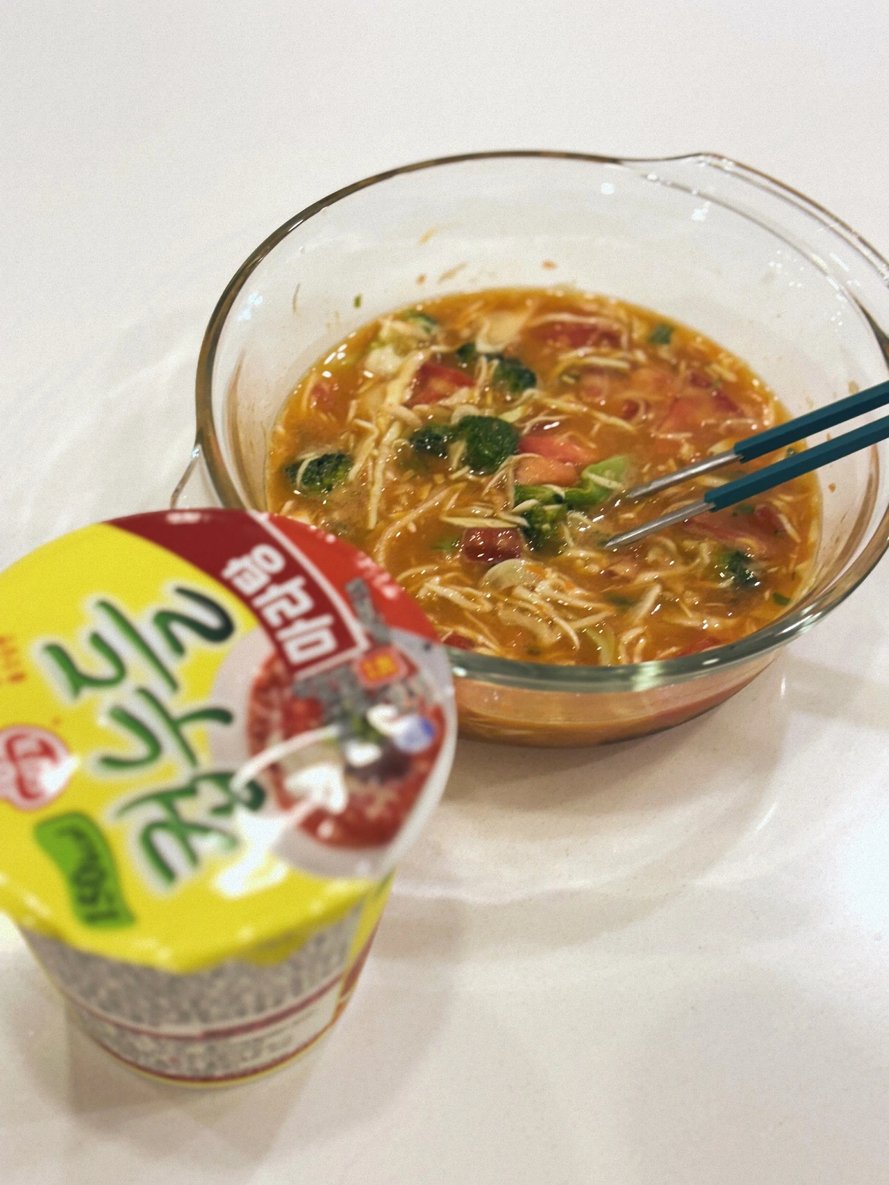 *재료: 컵누들 마라탕맛 1개, 계란 3개, 취향의 채소들, 참기름