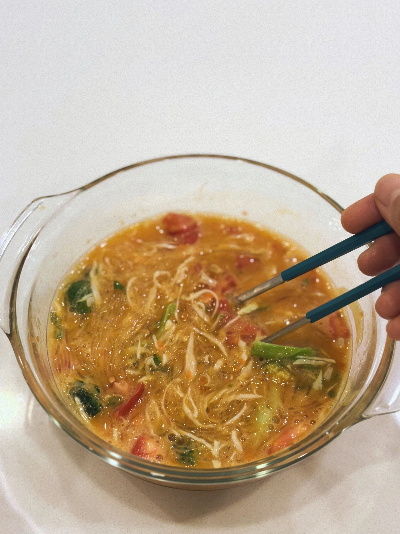 - 면이 익으면 물을 따라버리고 가위로 면을 잘게 잘라 채소+계란이 있는 전자레인지 용기에 넣어 섞는다