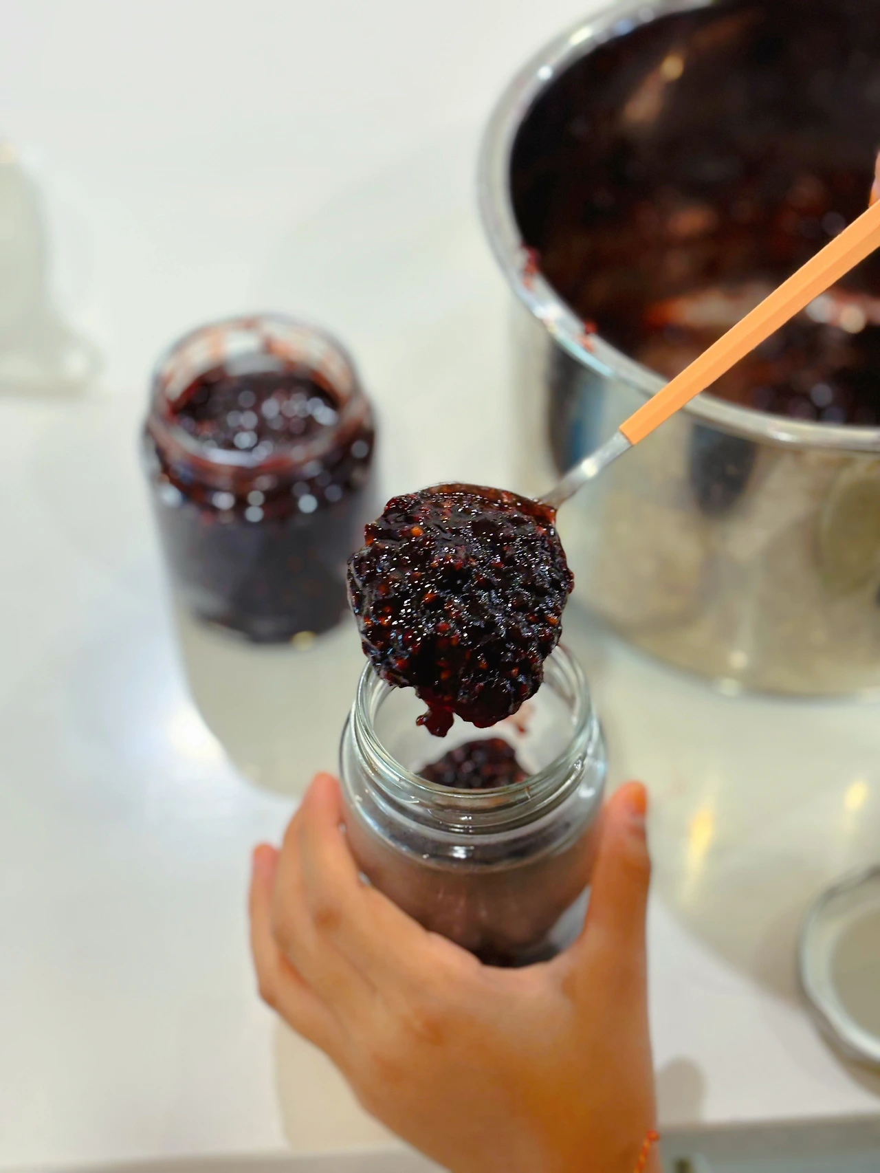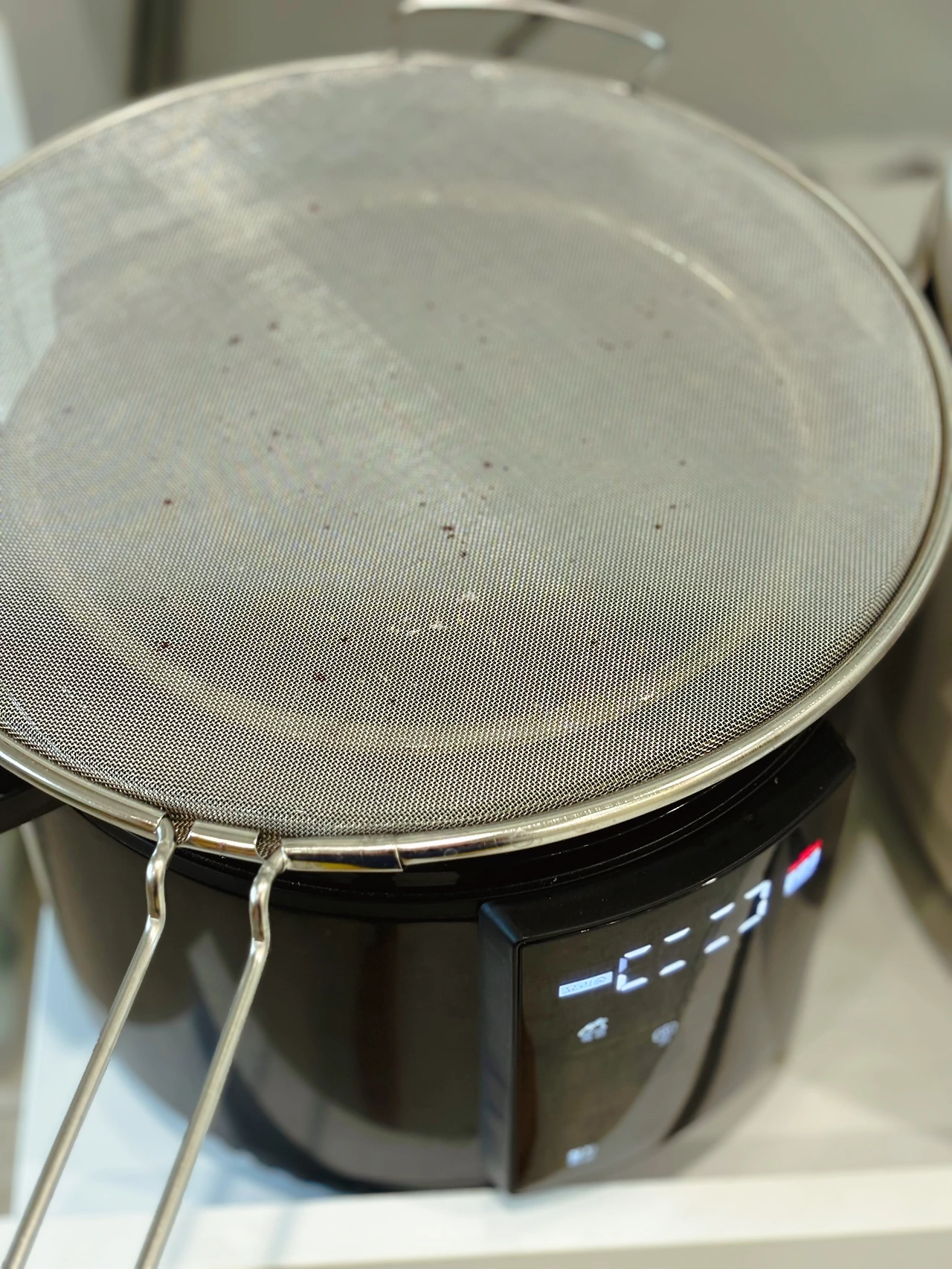 열이 올라 부글부글 끓기 시작하면 묽은 잼이 조금씩 튀기 시작한다. 이때 '기름방지망'이 있다면 활용하는 것을 추천한다. 그 망의 구멍으로도 튀어나오긴 하지만 꽤 많이 막아주는 역할을 한다.