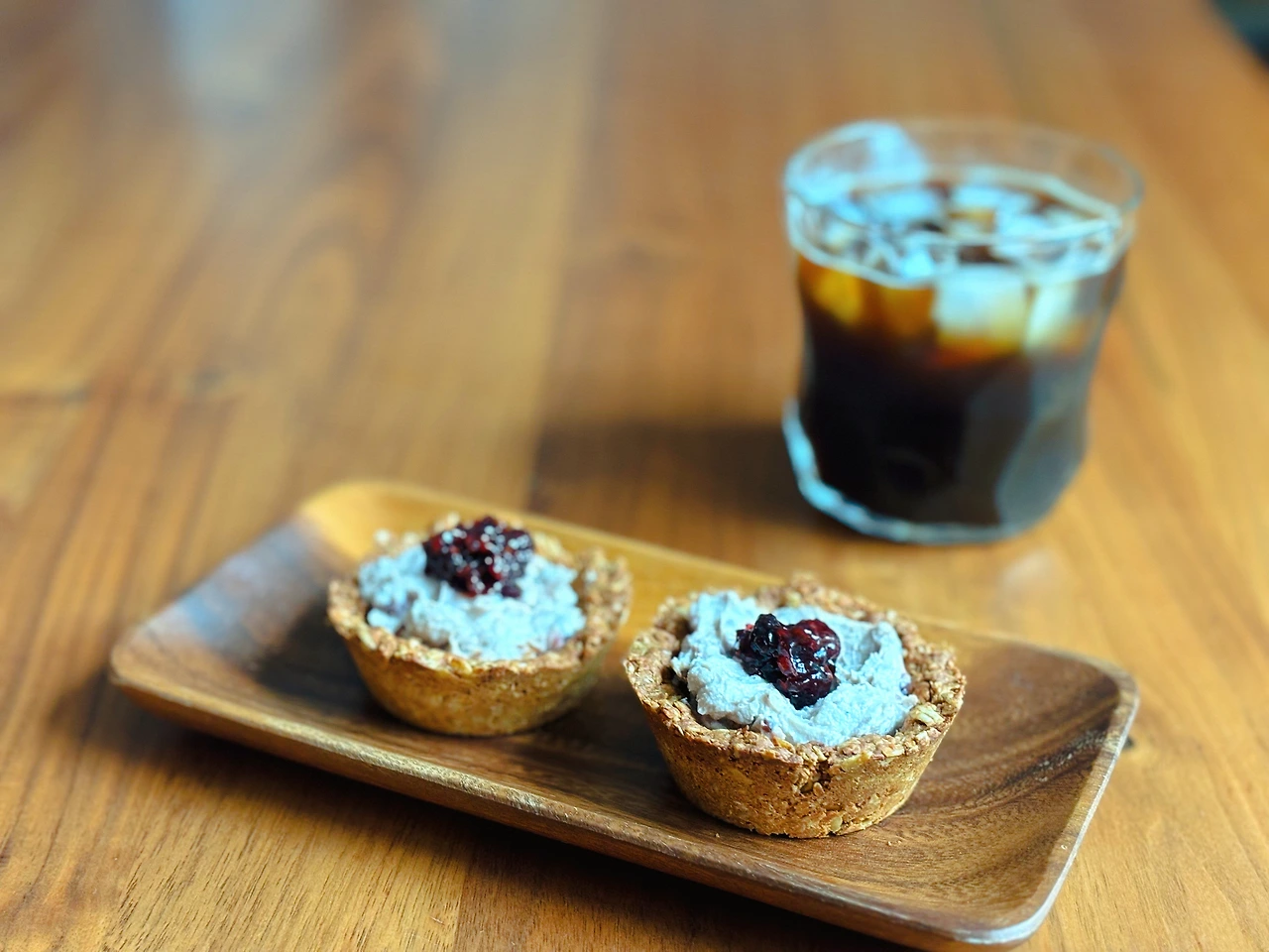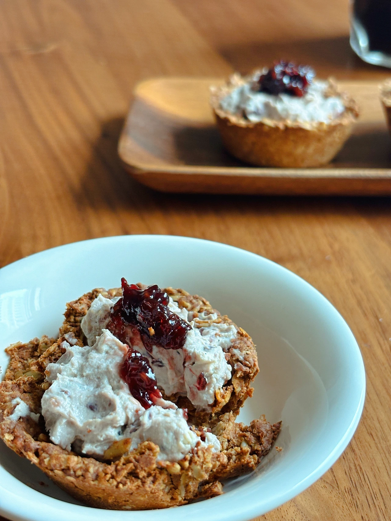 비건그릭요거트에 복분자 잼을 섞어 필링을 만들어주고, 그 위에 복분자 잼을 살짝 한번 더 얹어주었다.