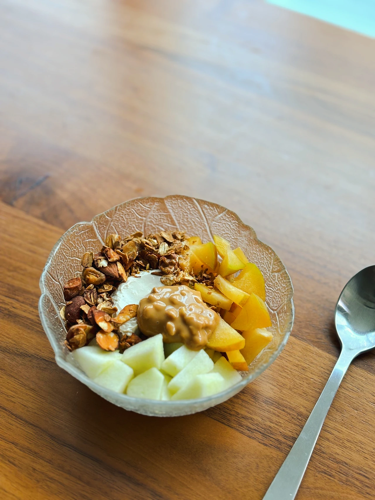 아침식사로 비건 그릭 요거트에 과일 많이, 그래놀라 한 줌을 올려 먹으면 맛있고도 든든하다. 가끔 땅콩버터를 한 스푼 올려 함께 먹기도 한다. 부담 없는 아침식사로 추천!
