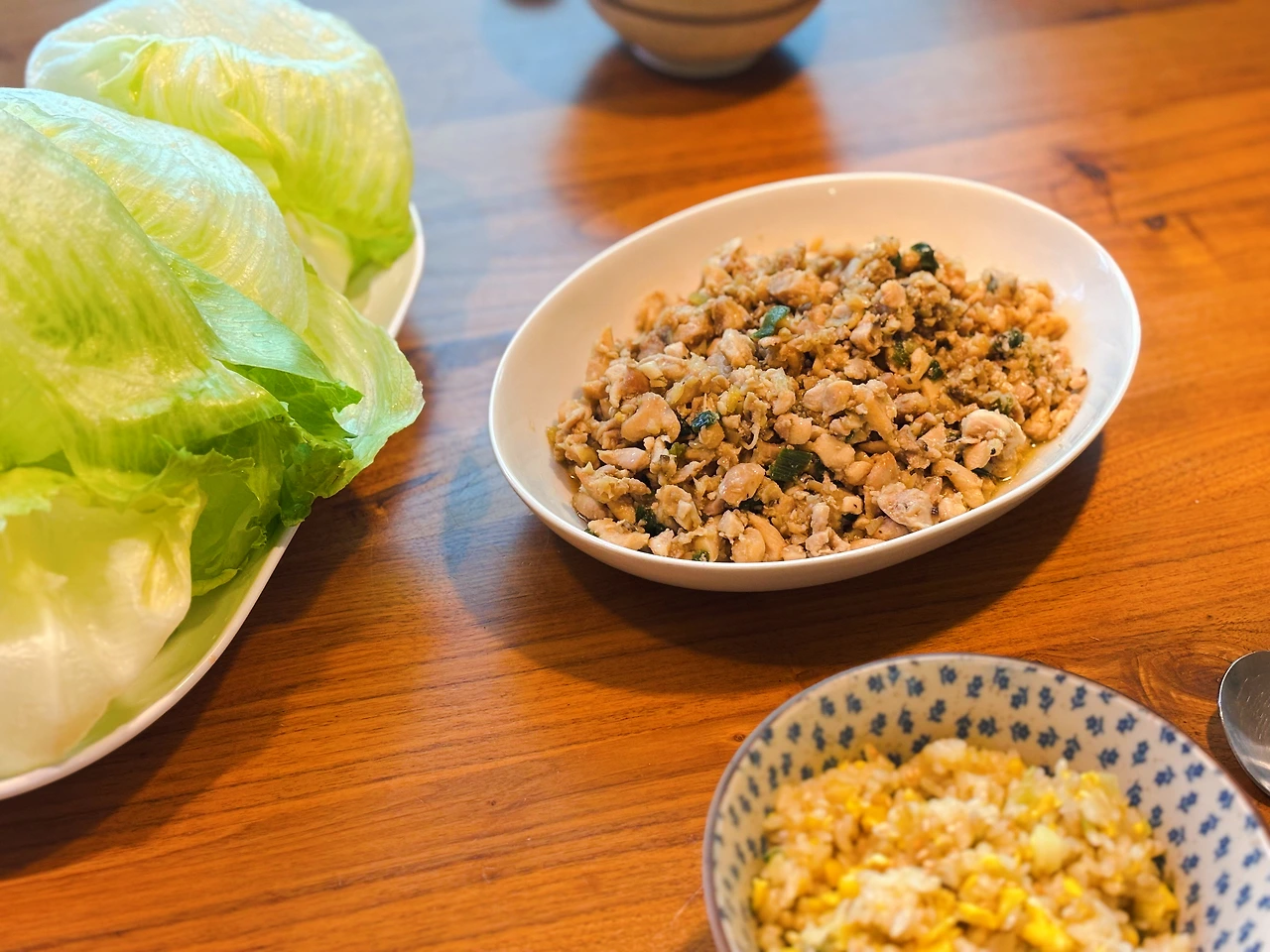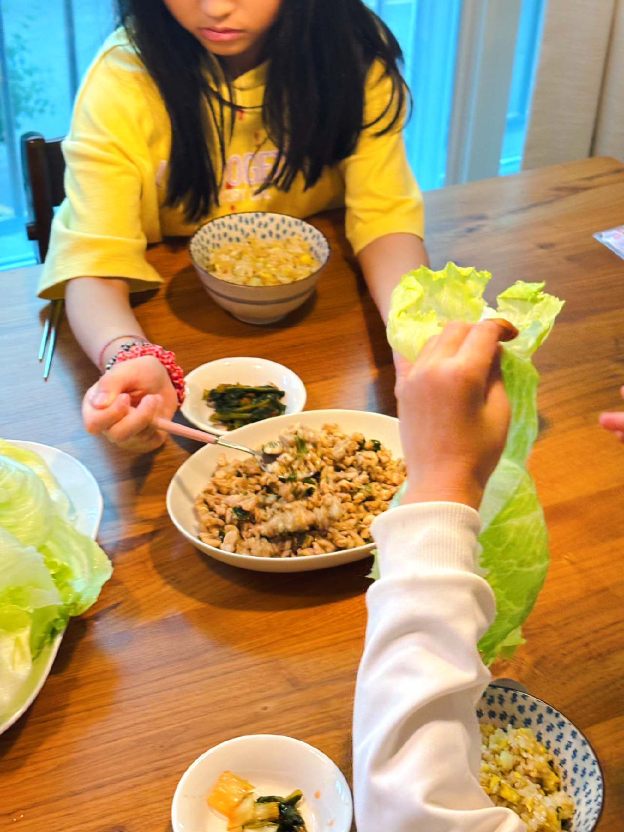 무엇이든 잘 먹는데 채소도 잘 먹는 우리 집 어린이들은 이 치킨 레터스랩에 열광했다. 숟가락으로 닭고기를 푹 퍼서 양상추에 올려 우걱우걱 먹는데, 분명 4인 가족이 나눠먹으려고 만든 요리를 두 어린이가 순식간에 다 먹을 판이었다. 자제시키고 겨우 애비에게도 맛을 보여줬다. 다음에는 닭고기 1kg 이상은 해야 하나 싶었다. 닭고기 다지는 과정만 좀 편하게 해결하면 더 자주 해 먹을 만한 메뉴인 듯하다.