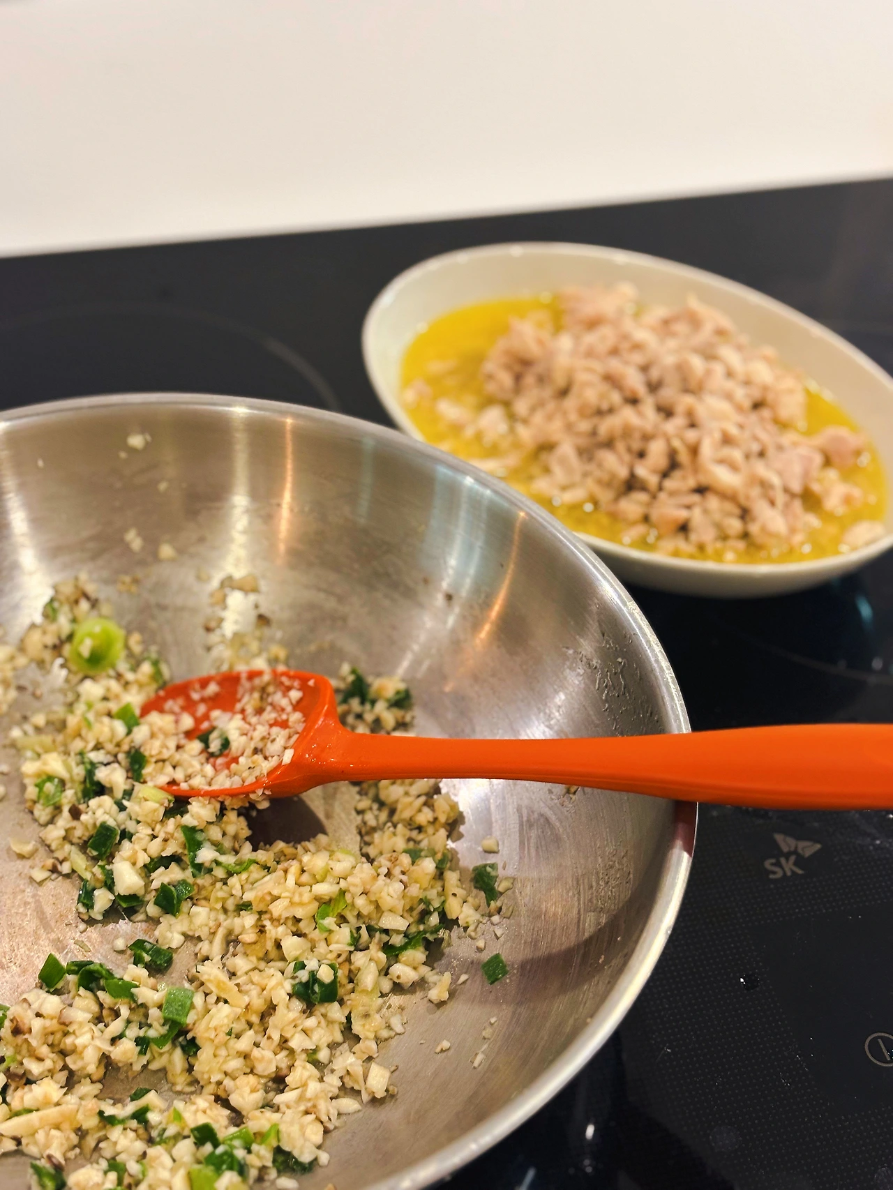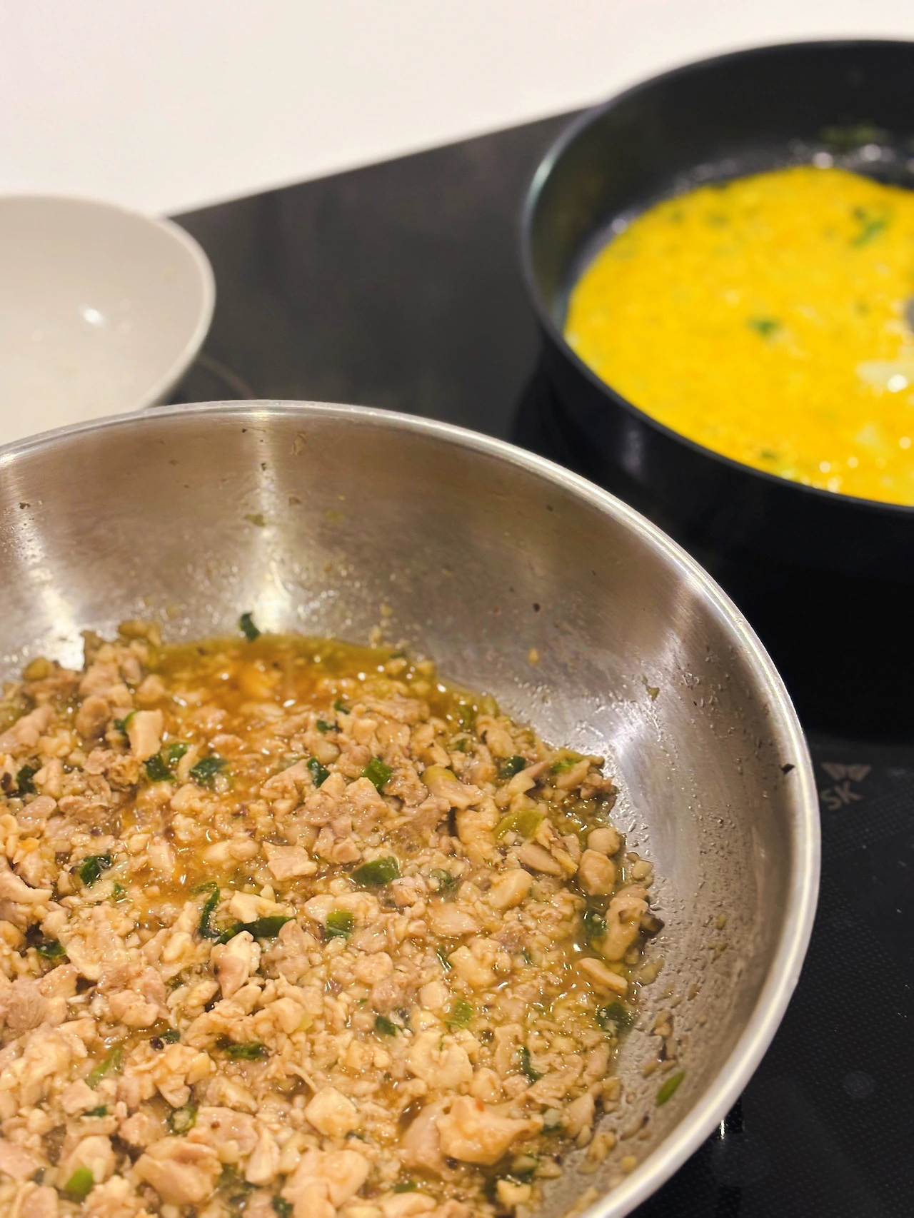 - 팬에 다진 닭고기를 볶아주고 접시에 덜어둔다