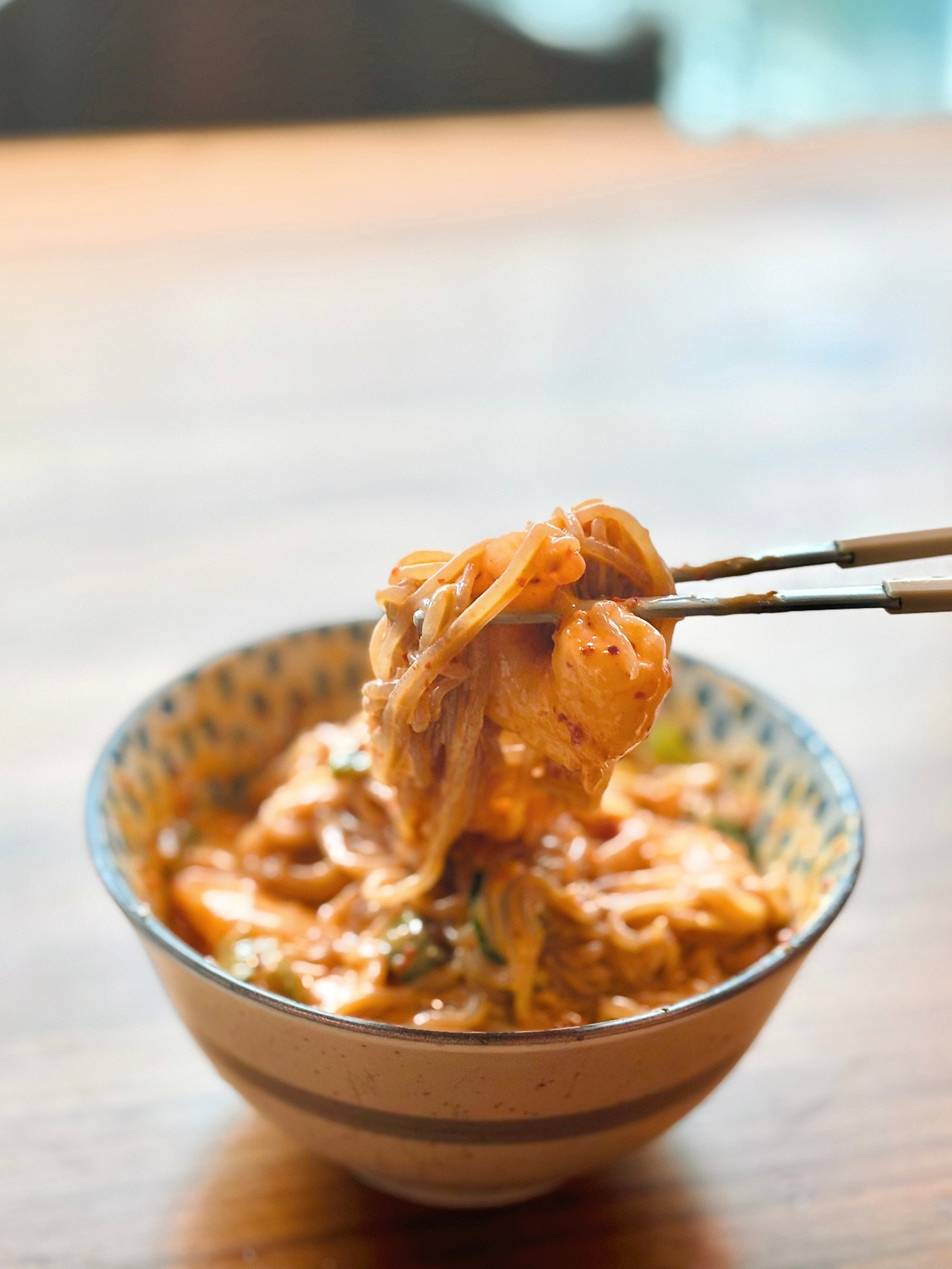 곤약메밀면은 가볍게 헹군 후 물기를 최대한 빼서 사용했다. 밀가루 없이 만들어진 면류는 거의 다 비슷하게 사용하면 될 것이다. 양념이 꾸덕한 편이라 매끈매끈한 곤약메밀면에도 착 감겼다. 드디어 곤약메밀면을 맛있게 소진할 수 있겠다.