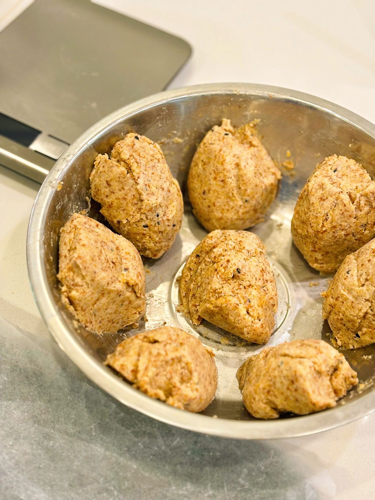 *재료: 아몬드가루 150g, 타피오카전분 50g, 그릭요거트 120g, 베이킹파우더 2g, 소금 2g, 알룰로스 2T, 토핑용 검은깨 조금