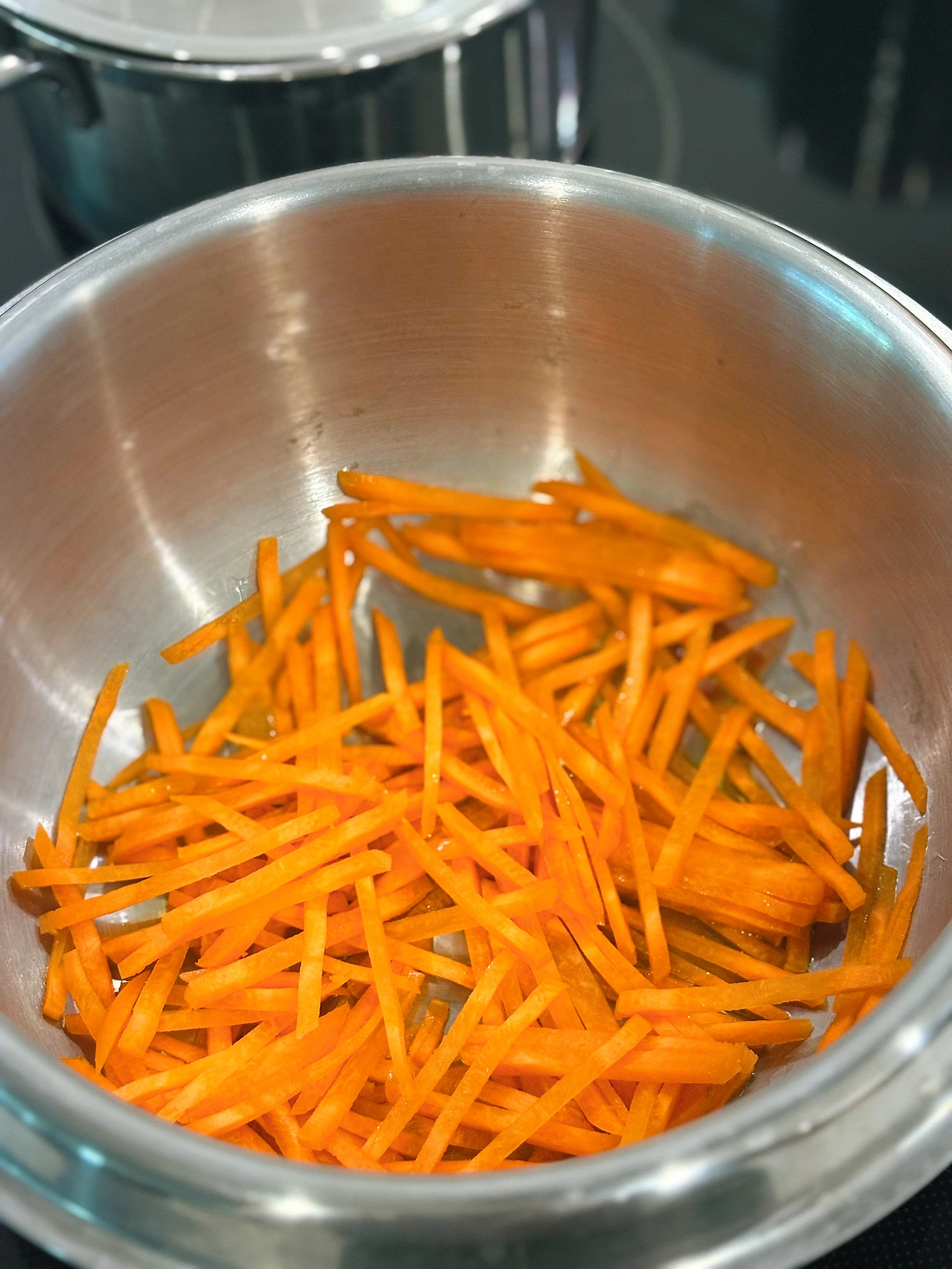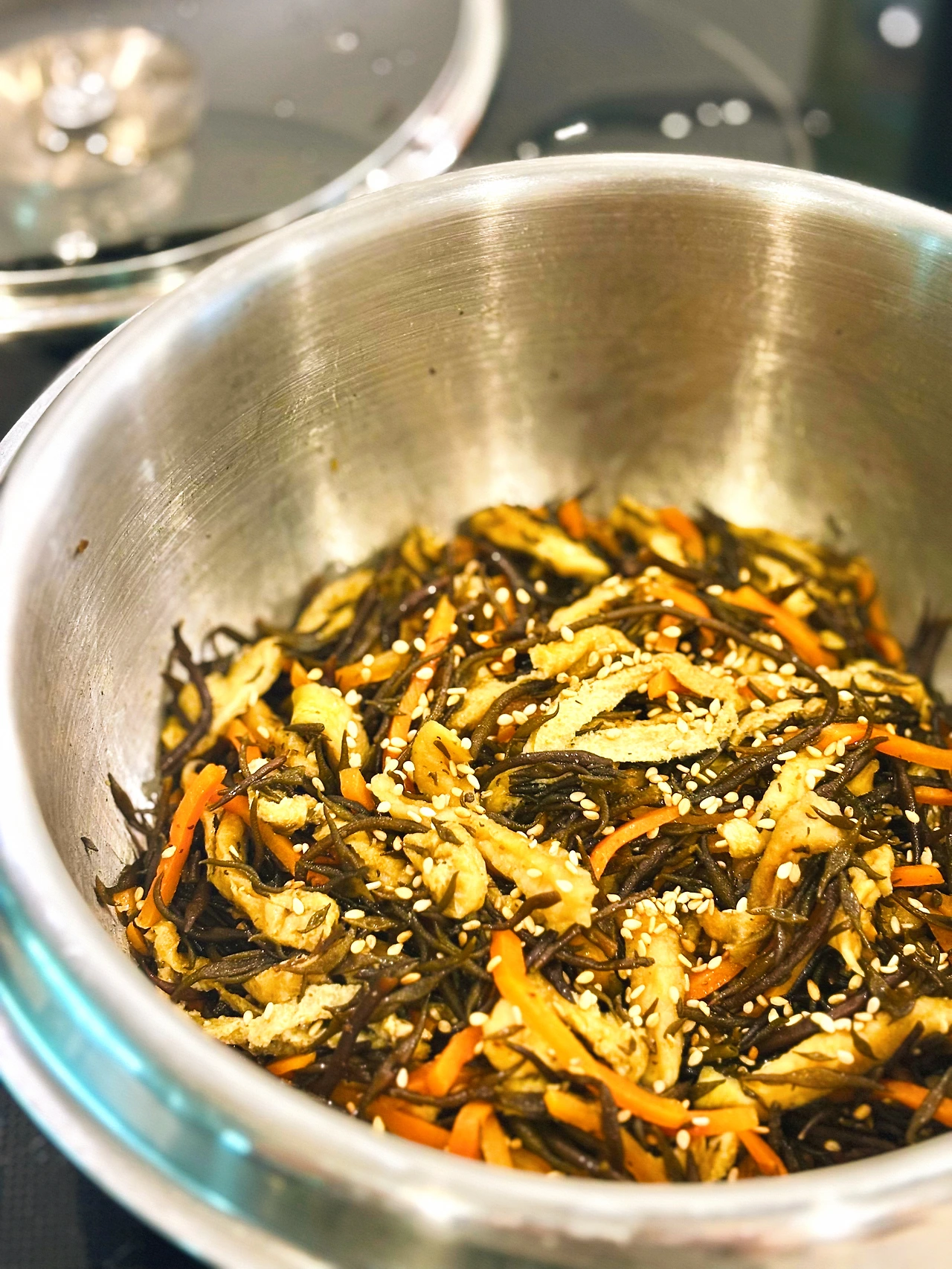 - 예열한 두툼한 냄비에 식용유를 두르고 ‘당근>무말랭이>톳>양념,유부’ 순서로 넣어 볶는다