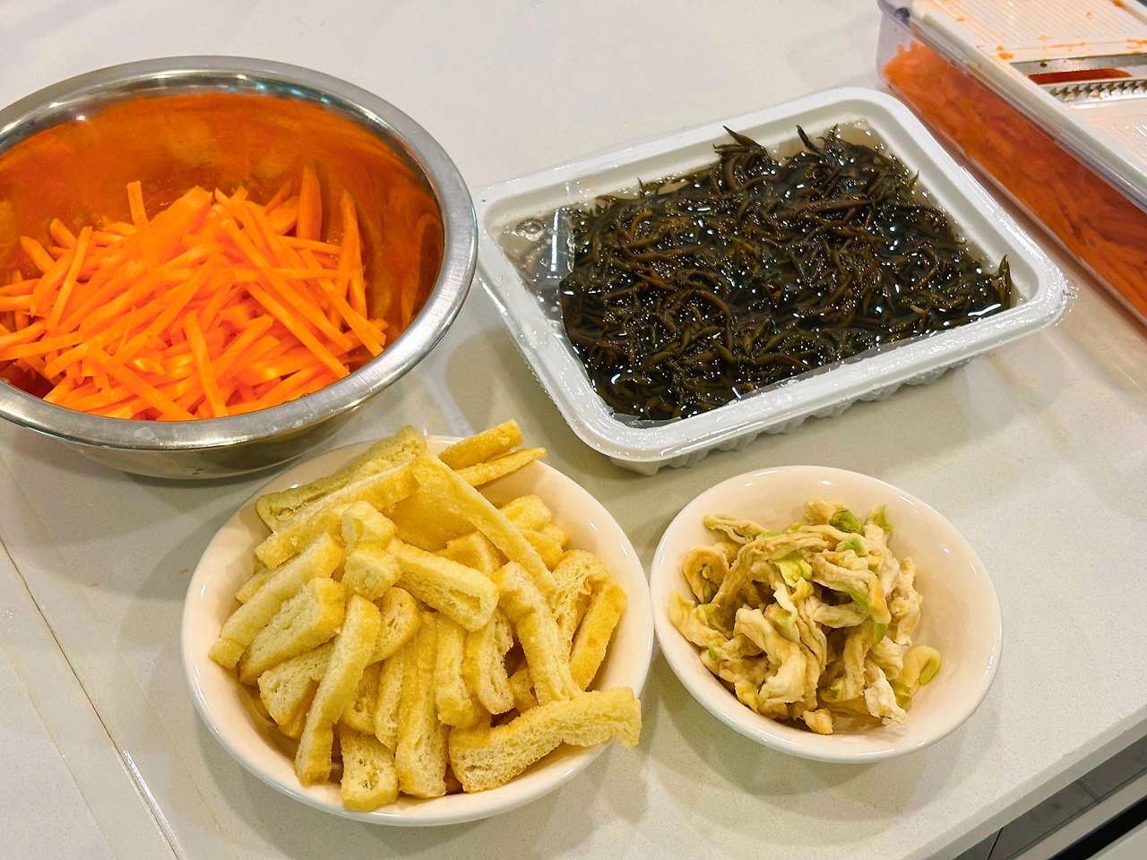 - 당근과 유부는 적당한 두께로 채썬다