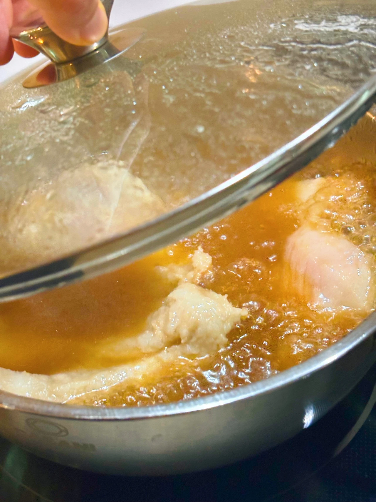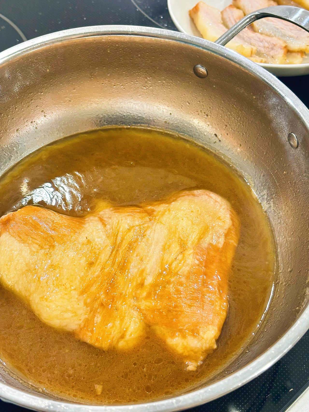 *재료: 항정살 500g, 물 700ml, 간장 100ml, 맛술 100ml, 설탕(대체당) 3.5T, 미소된장 1T, 버터 1~2T