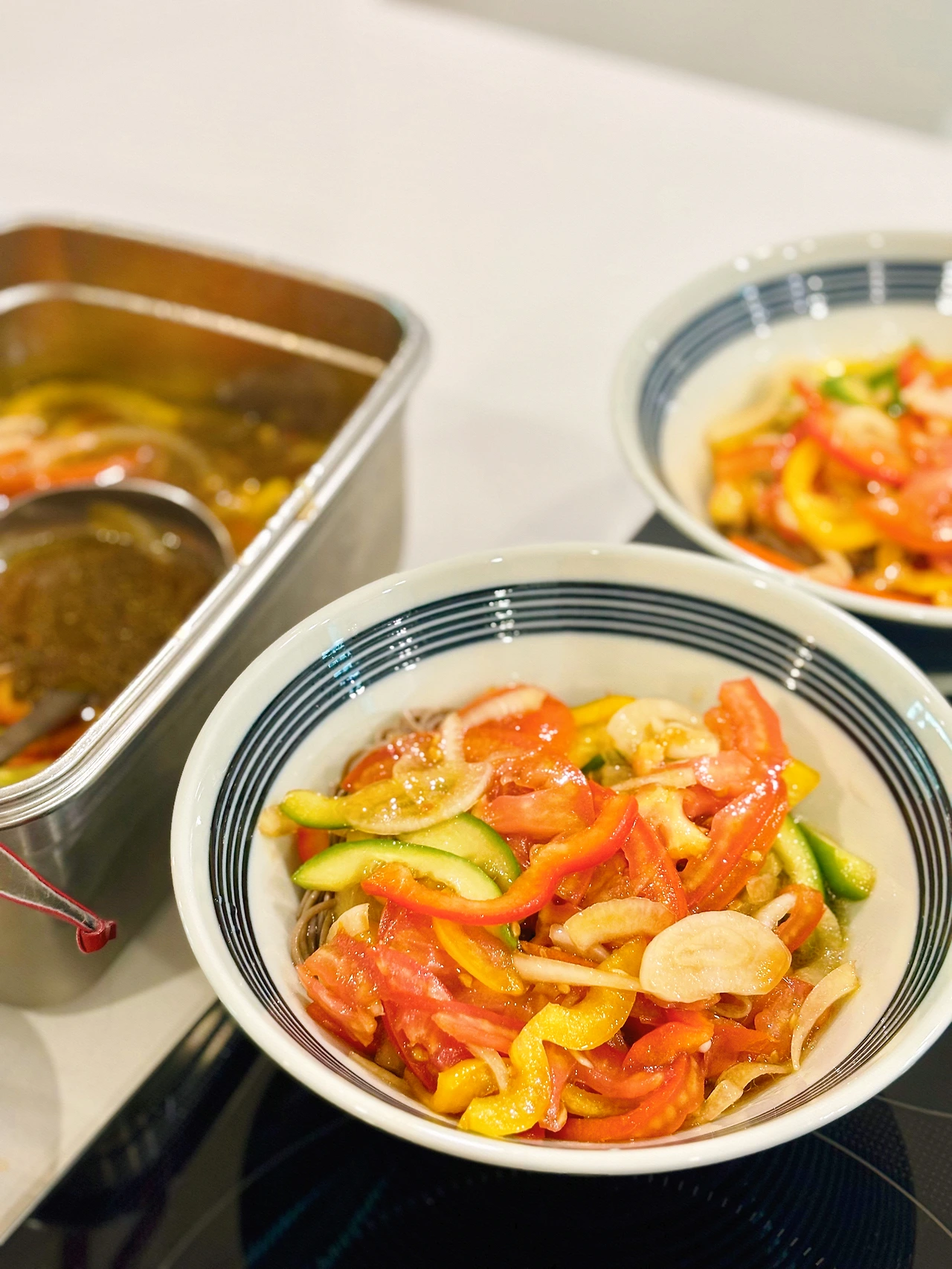 2시간 숙성하고 바로 먹어보았다. 메밀두유면과 곤약메밀면 두 가지로 먹어봤는데 생각보다 곤약면과 잘 어울렸다. 곤약면을 선호하지 않는 나도, 아이들도 곤약면 쪽이 더 맛있었다. 면이 얇을수록 잘 어울리는 듯하다.