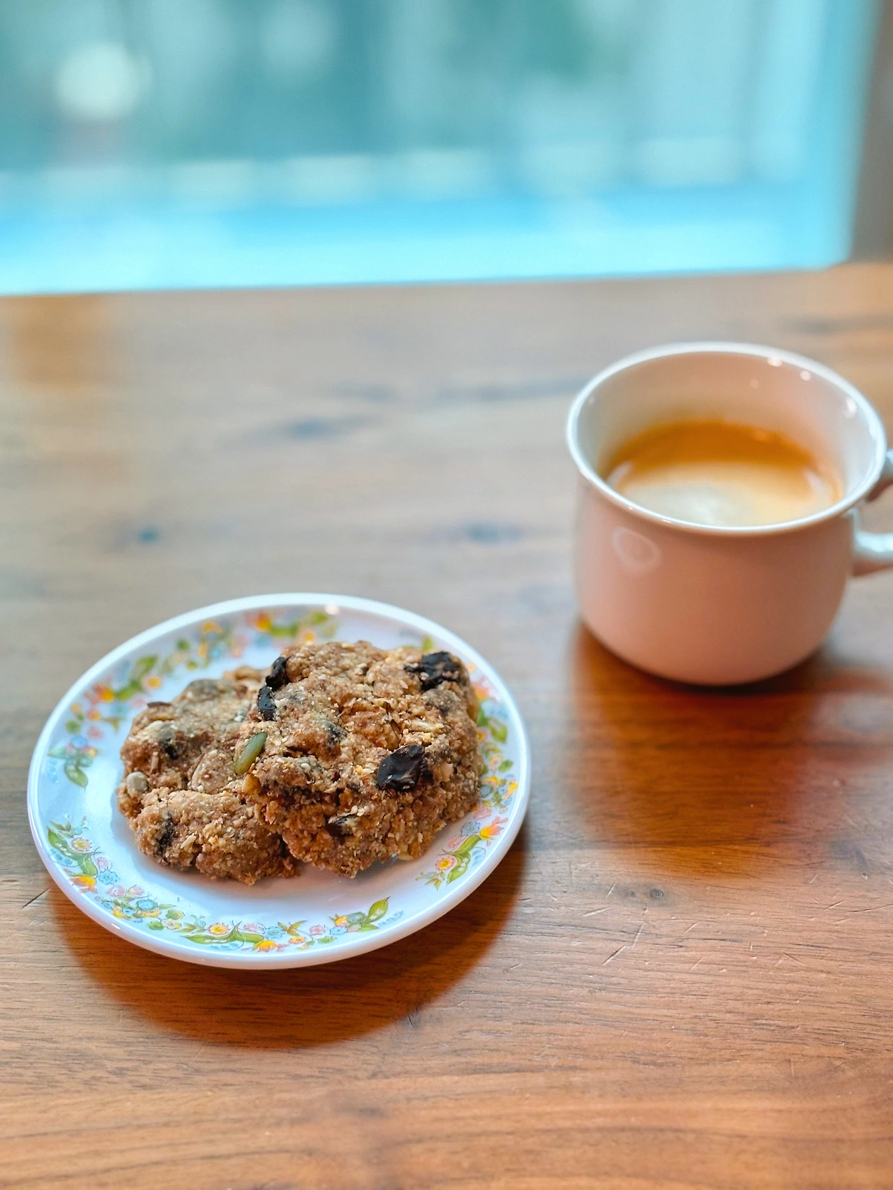 *재료 : 아몬드가루 3T, 통밀가루(or 간 오트밀) 3T, 당류 1~1.5T, 올리브오일 2T, 견과류, 카카오매스(or 원하는 초콜릿)