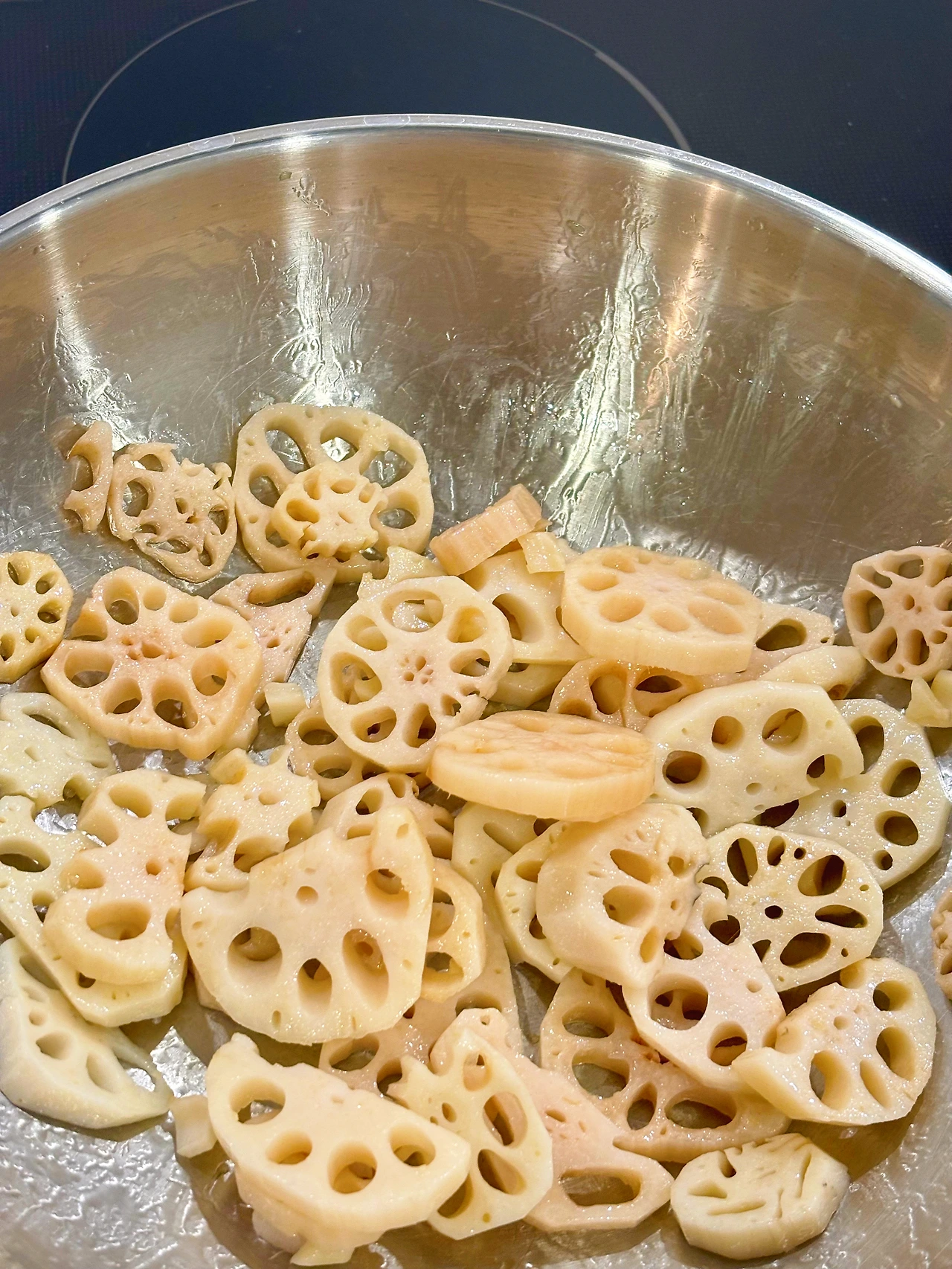 - 팬에 식용유를 두르고 연근을 5분가량 충분히 볶는다