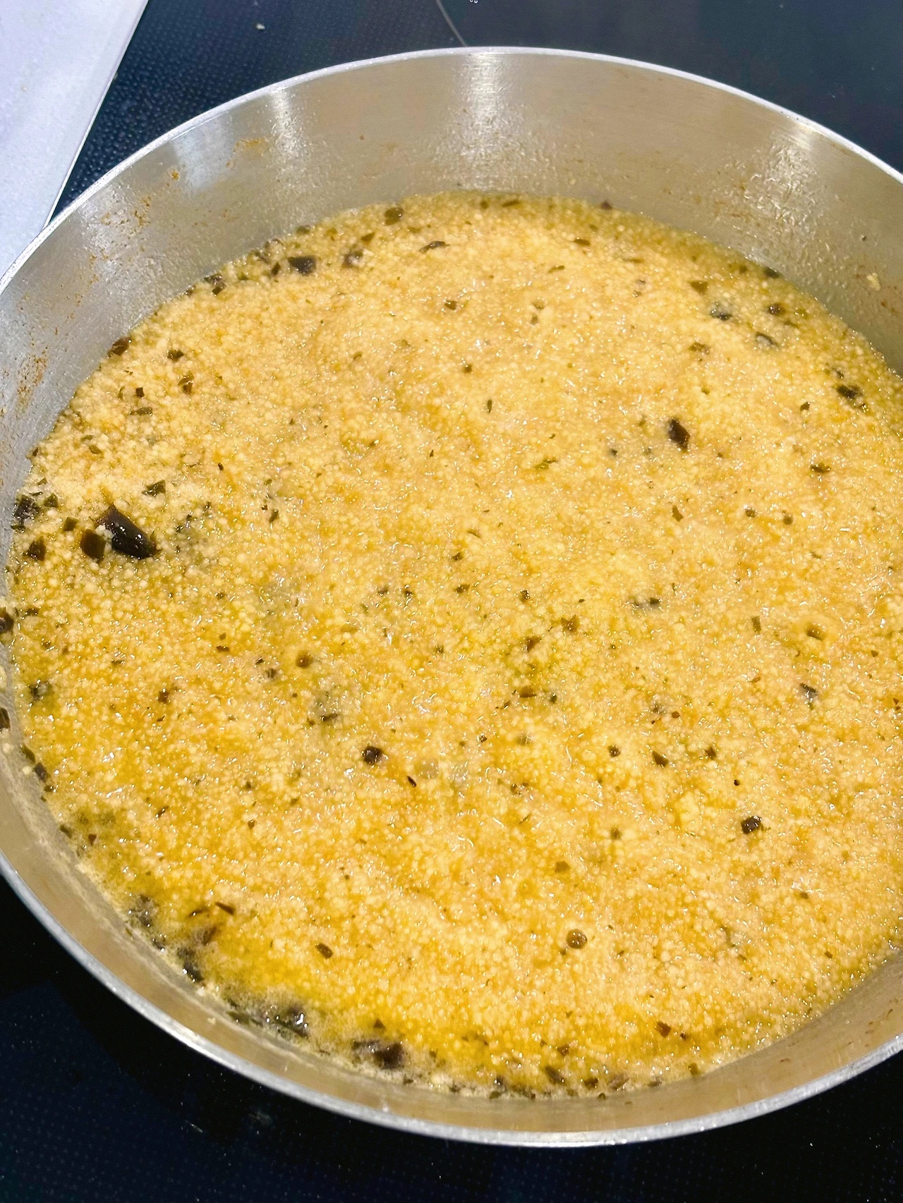 - 팬을 키친타월로 살짝 닦아 주고, 버터를 녹여 중약불로 쿠스쿠스를 볶아준다. 올리브오일을 함께 넣어도 좋다