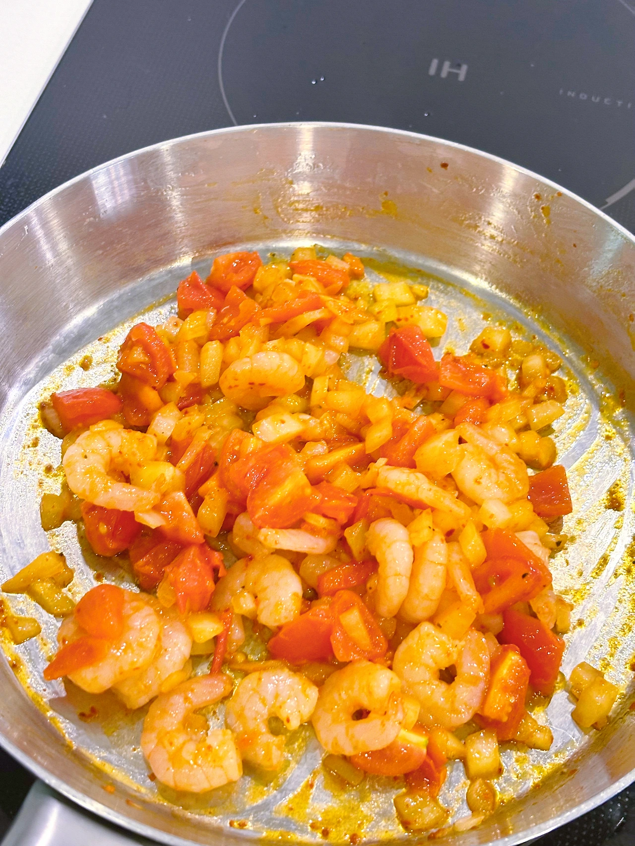 - 새우가 90% 정도 익으면 토마토를 넣어 볶는다