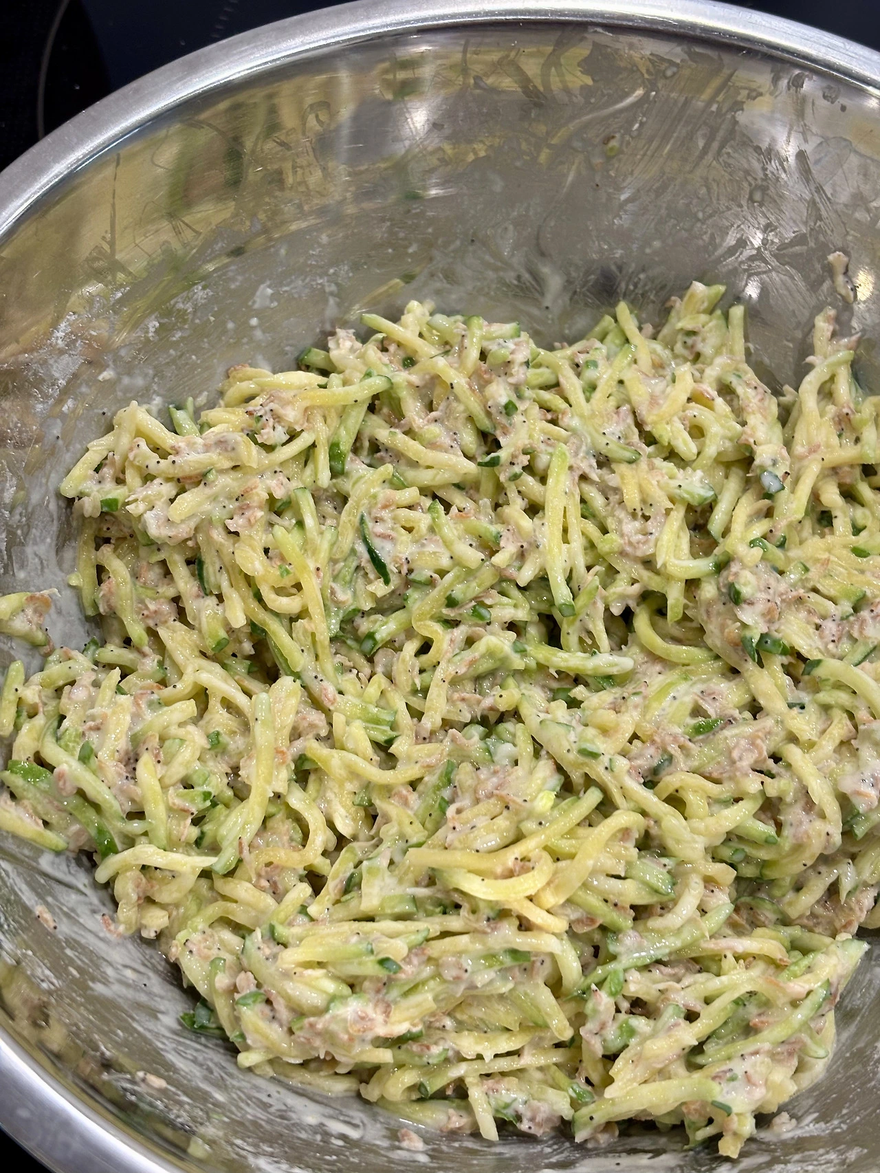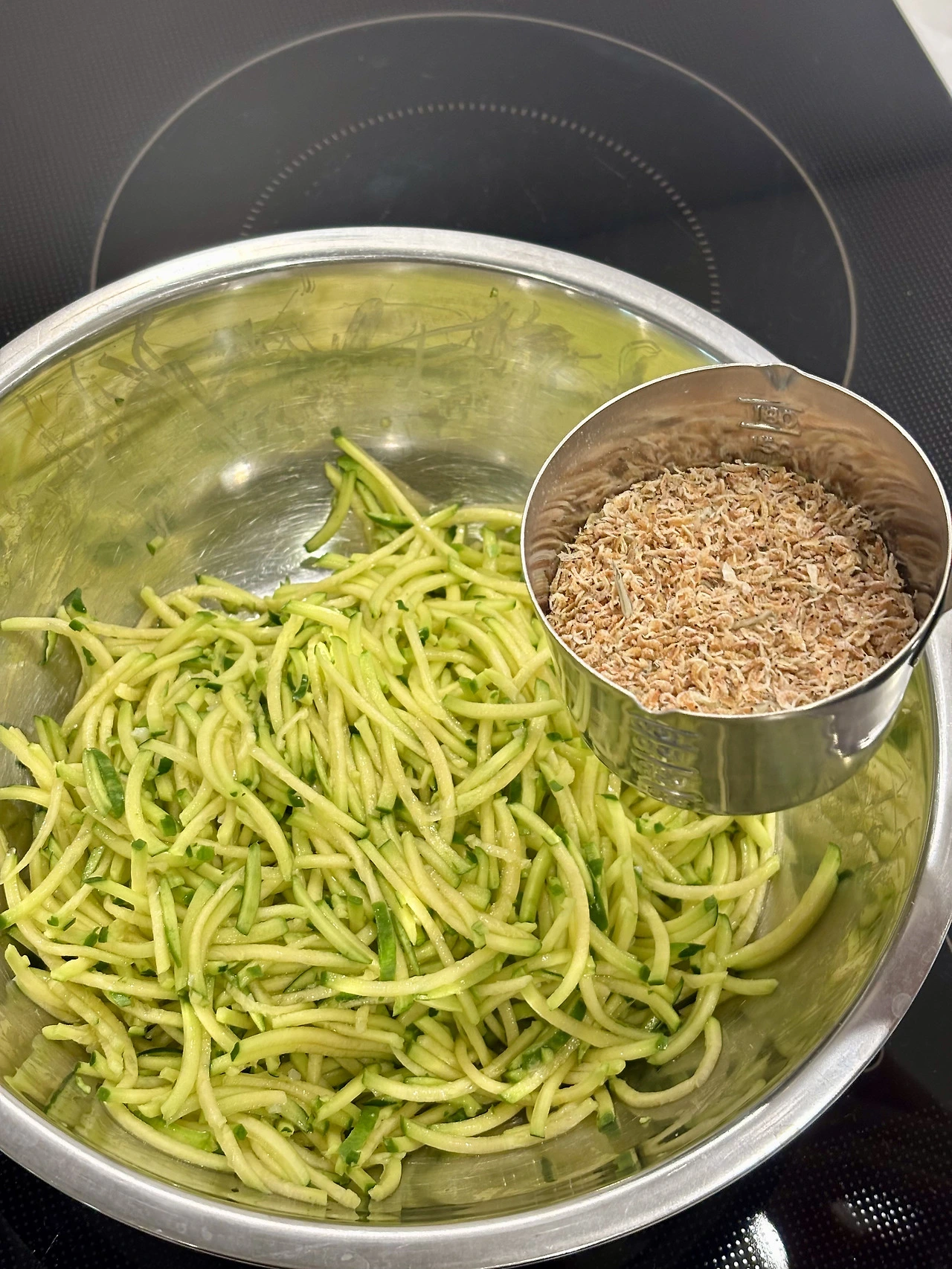 - 절인 애호박이 담긴 볼에 건새우와 가루류를 넣어 섞어준다