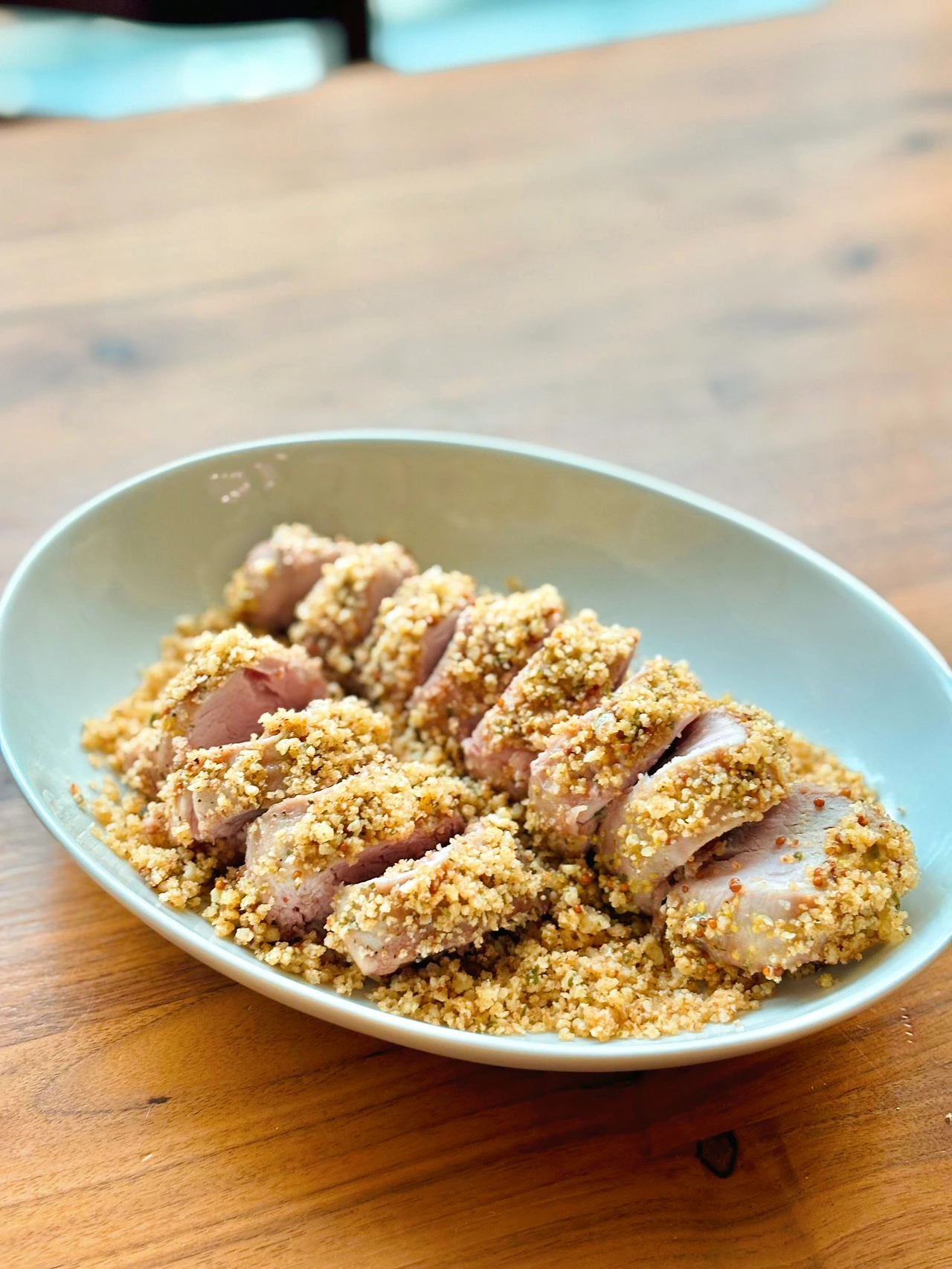 *재료(2~3인분 기준) : 돼지 안심 600g, 올리브오일, 소금, 후추, 빵가루 1/2컵, 경질 치즈류(그라나파다노, 파르미지아노 레지아노 등) 혹은 파마산 치즈가루 1/4컵 정도, 디종머스터드, 파슬리 가루(선택)