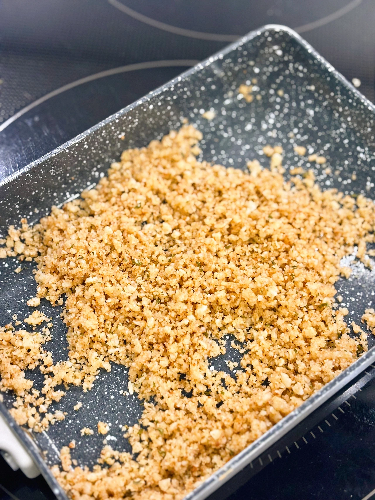 - 마른 팬에 빵가루를 약불로 볶는다. 노릇해지면 치즈 가루를 넣어 함께 볶아주고 충분히 노릇해지고 바삭한 느낌이 들면 파슬리 가루를 넣어 살짝 더 볶는다