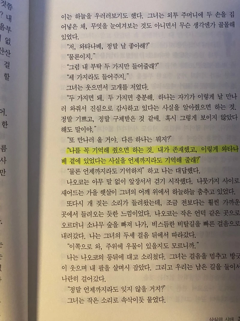 소설의 극초반, 이미 어른이 된 와타나베가 비행기 안에서 어린 시절을 회상하는 부분이다. 몇 번을 읽어도 이 부분에서 머리가 아프지 않을 수가 없었다. n회독을 할 때마다 이 페이지에서 머무르는 시간이 길어졌다.