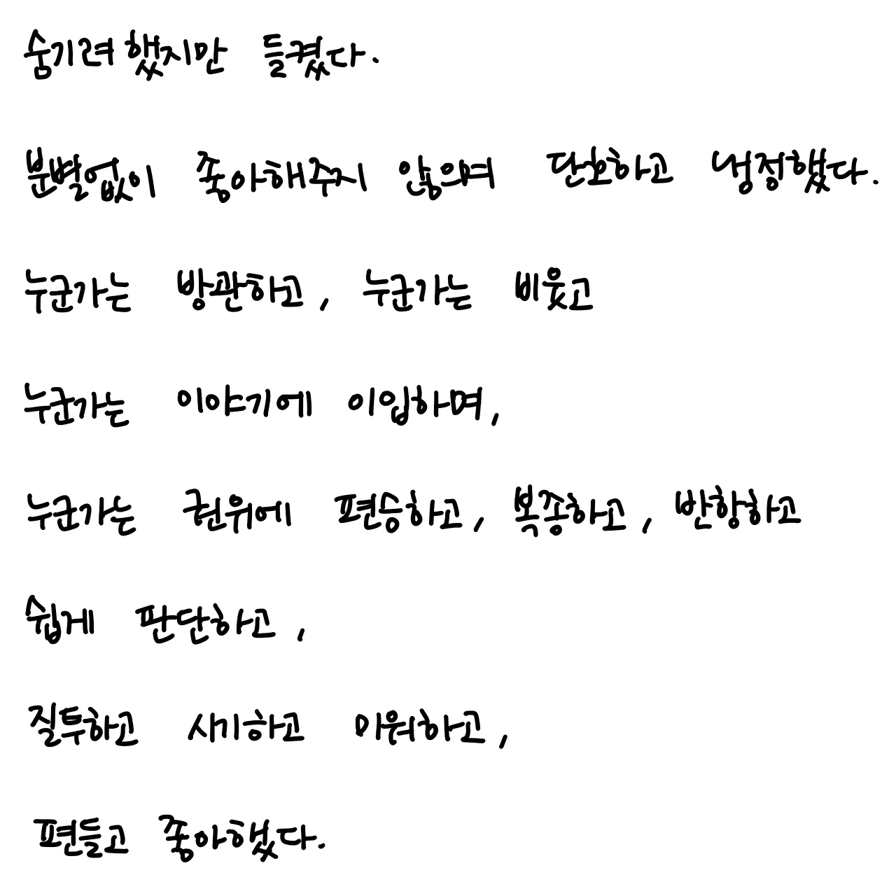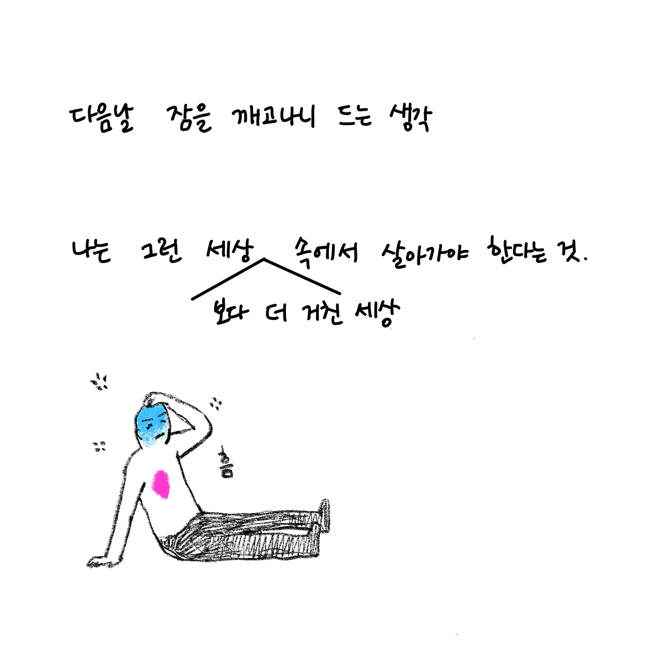 전 이제까지 상담을 메인으로 두고 있었다고 생각했는데 제가 요새 이렇게 힘든 건 그렇지 않아서였다는 걸 이번 집단을 통해 깨닫게 됐어요. 앞으로도 저는 상담을 메인으로 하게 될 것 같은데 그러려면 그림은 좀 더 뒷전이 될 것 같습니다. 하지만 뒷방구석에 처박아두지는 않을것 같고 제가 그리고 싶을 때, 좀 더 가볍게 천천히 그리려 합니다. 계속 그런 방식을 원해왔었는지도 모르겠어요.