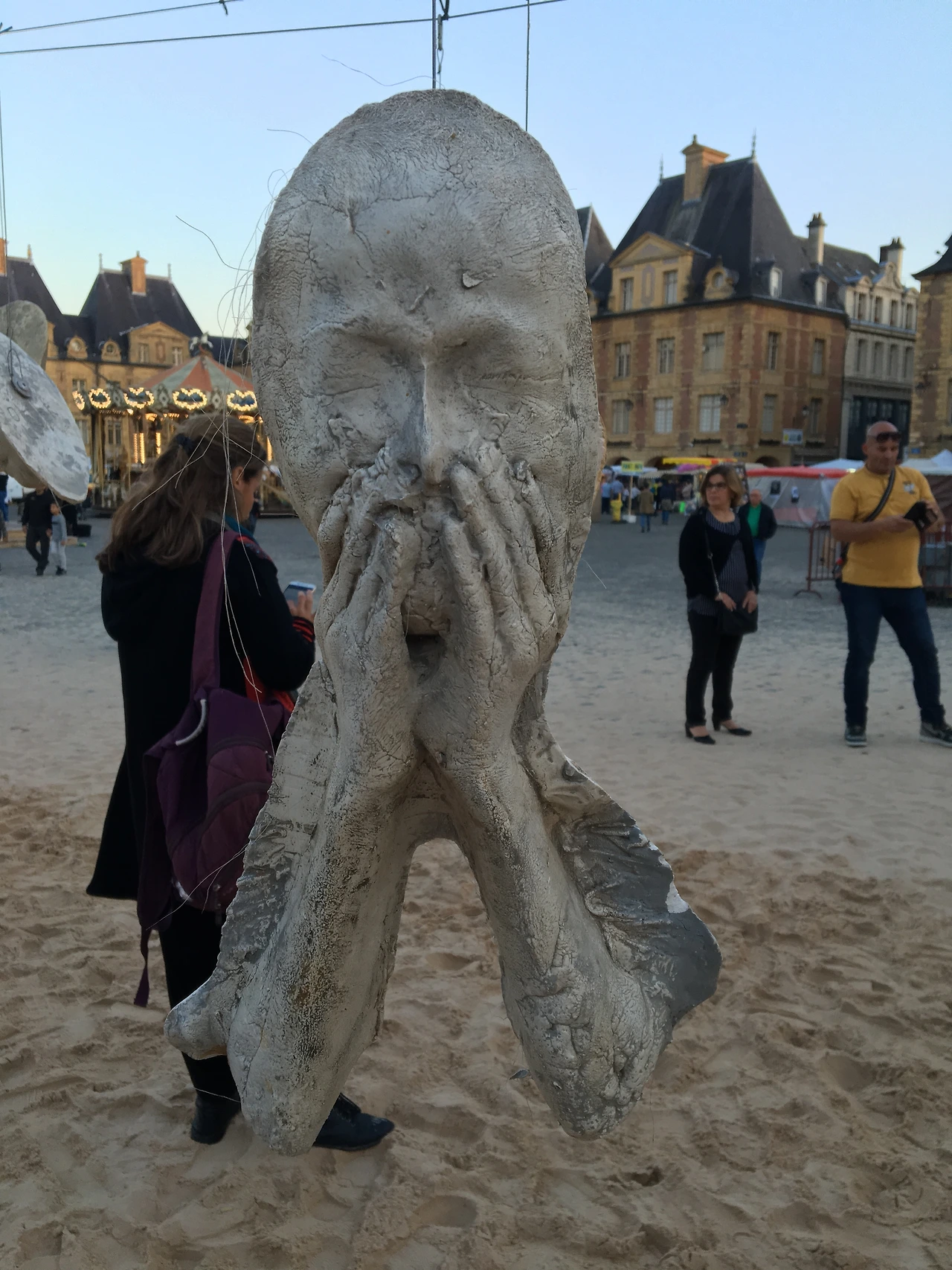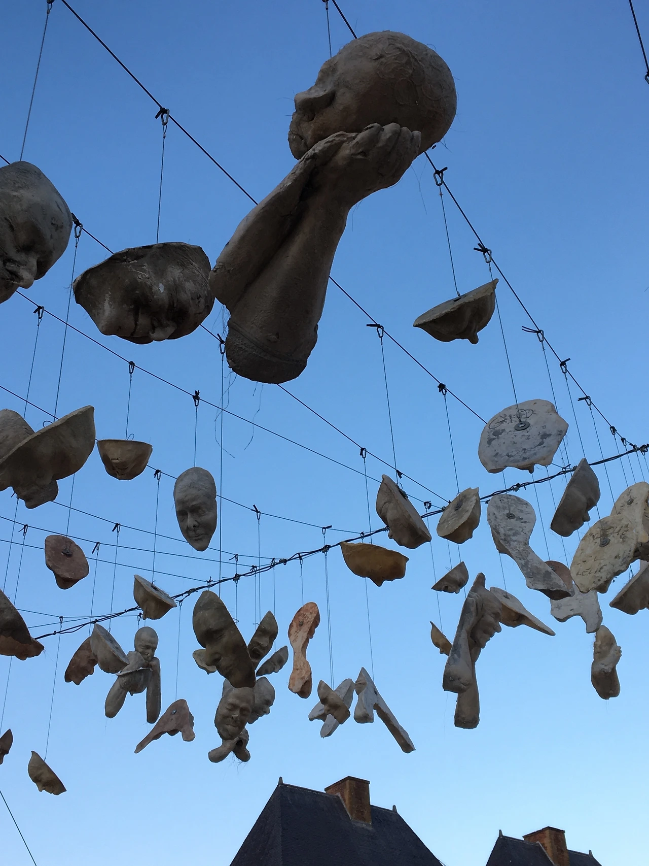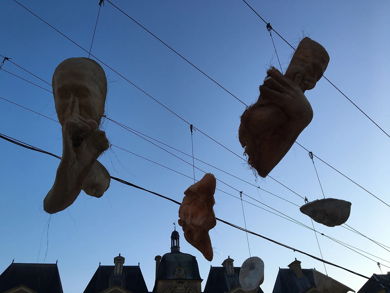 원하는 사람은 그 누구든 저 커다란 얼굴 안으로 들어갈 수 있다. 그 입구에서 아티스트들이 발을 씻겨 주는 의식을 치러준다고 했다. 이런 정화를 거쳐 얼굴 안에 들어가 설치된 작업실 안에서 자신의 얼굴이라던가 손을 찍어내게 되고, 다 마르면 그걸 어딘가에 파묻어놓고 다시 파내는 과정을 거쳐 줄에 건다는 것이었다.