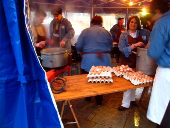 커다란 천막 안에는 거인이 사용할 것만 같은 대형 프라이팬이 설치되어 있었다. 이윽고 눈앞에서 1000개의 달걀들이 하염없이 깨어지고 또 깨어져서 큰 통 안에 천 개의 눈알처럼 동동 떠 있었다. 이 과정을 모조리 지켜보고 싶었지만, 아직도 베이컨과 밤을 써는 과정이 한참 남아 있었고 나 외에 구경꾼이 딱히 없었으므로 근처 골목들을 두 바퀴쯤 더 돌고 다시 갔다. 마침 요리는 완성되어가고 있었다. 몇몇 시식 대기자들이 또 있었다.