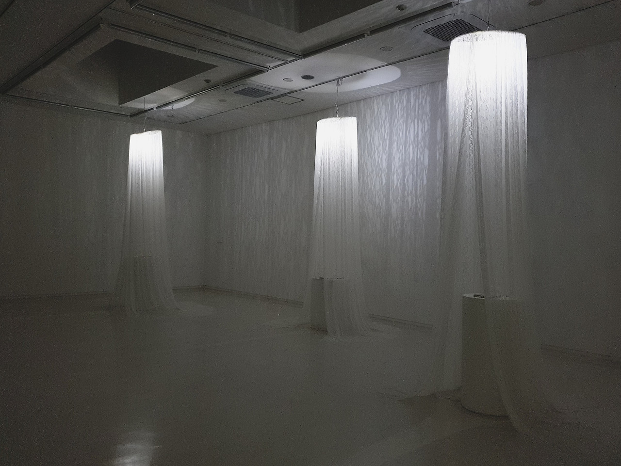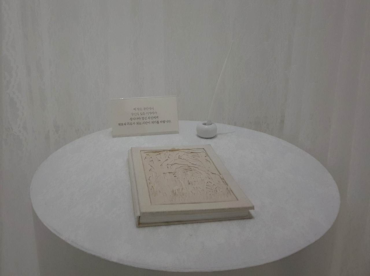 며칠 전 마주했던 한송이 작가의 설치 작품 <하얀 비밀>이 이 밤길의 풍경과 겹쳐 떠오른다. 전시장에 들어섰을 때, 공간은 깊은 어둠 속에 잠겨 있었고, 거리의 가로등처럼 단 세 개의 조명만이 희미하게 빛나고 있었다. 밝다기보다는 사물을 겨우 인식할 수 있을 정도의 침침한 불빛이었다. 서늘하게 감도는 기운은 작가 노트에 담긴 '비밀'이라는 단어에서 비롯된 것일 테다. 내가 섰던 세 개의 관객 참여 공간 중 하나의 불빛 아래, 하얀 백지에 쓰인 흔적들은 마치 공기 속으로 산화되어 흩날리는 듯했다. 작가는 관람객이 백지 위에 이야기를 적기를 바랐고, 나는 그 글자와 문장들이 곧 사라질 것임을 믿으며 몇 자의 문장을 흘려보냈다.