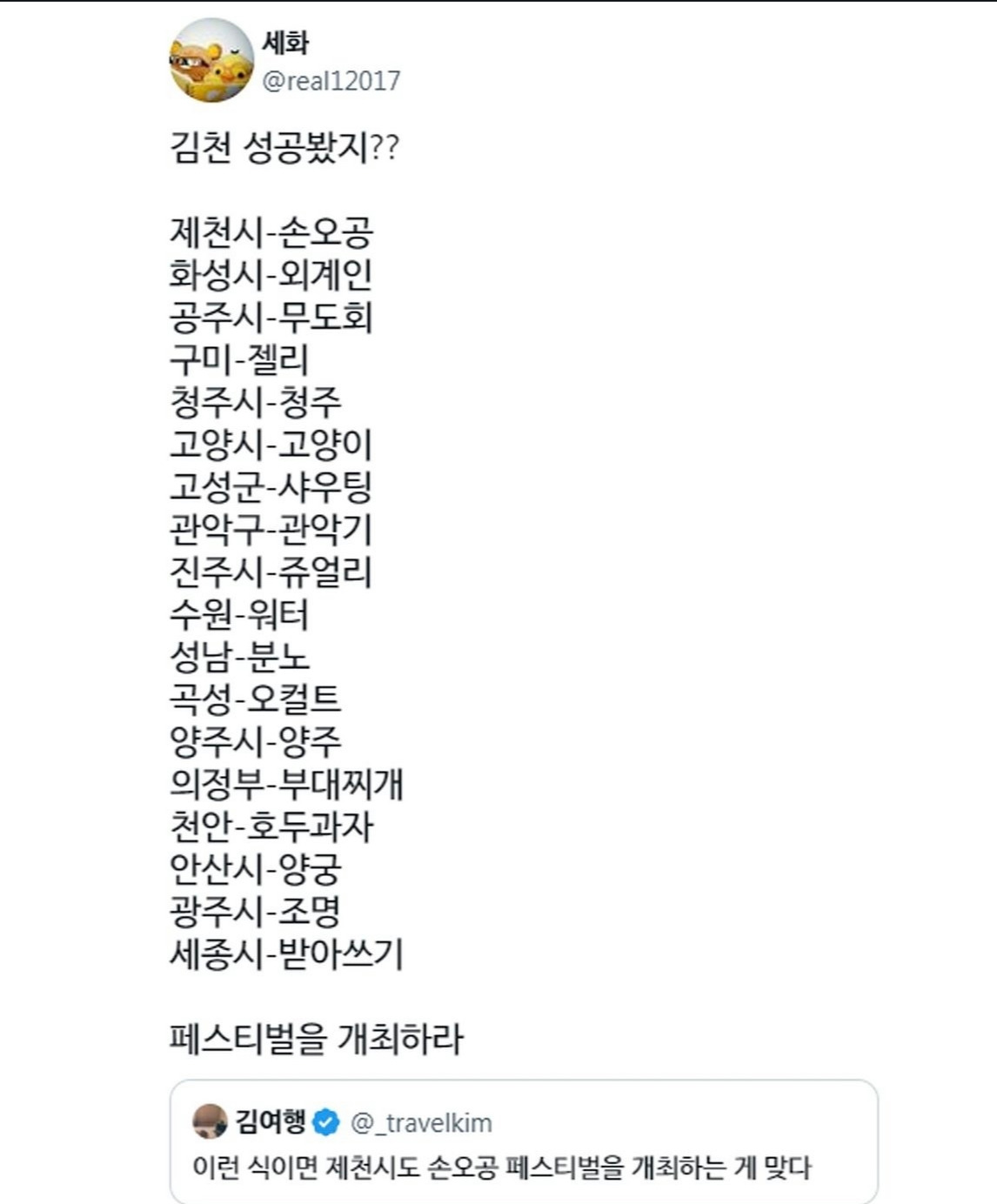 첫 번째는 '밈'화 될 수 있는 콘텐츠의 성격이다. 즉 콘텐츠의 성격이 누구나 응용하기 좋은 성격을 가지고 있다. 누구나 '김천시가 김밥천국 축제했대'라는 말만 들어도 축제의 성격이나 내용을 쉽게 이해할 수 있어 확장성이 좋다. 실제로 소셜미디어에서는 화성시는 외계인, 고성군은 샤우팅 축제, 제천시는 손오공 축제를 만들자는 재밌는 제안들이 나오고 있다.
