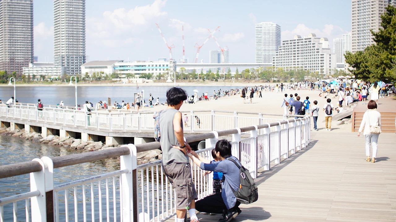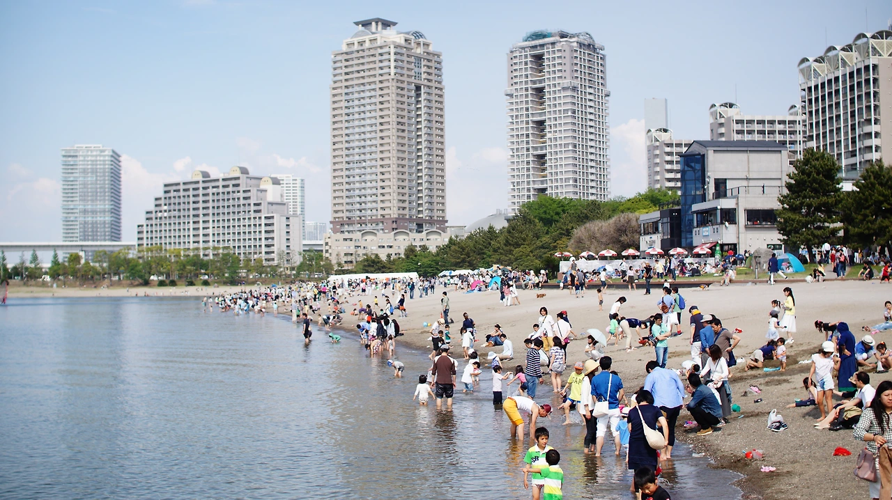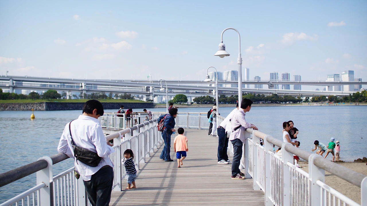 배에서 내리니 바로 인공해변이 보였다. 그때가 휴일이었는지 평일이었는지는 모르겠는데 사람이 많았다. 집 앞에 있는 바다에서 이렇게 물장구를 칠 수 있다니. 우리나라의 해운대는 바라보기만 해도 좋지만(피서철을 제외하고) 그곳은 진짜 바다라서 여기처럼 편하게 놀 수는 없다. 그래서 아이들을 데려온 가족들이 많았다. 너무 좋아보였으나 내가 물장구치러 온 것은 아니기 때문에 후지TV 건물도 찍고 여기저기 찍으며 지나갔다. 누나는 디지몬을 보지도 않았으니 아마 원형구조물에 잠시 시선이 머물렀을 뿐일 것이다.