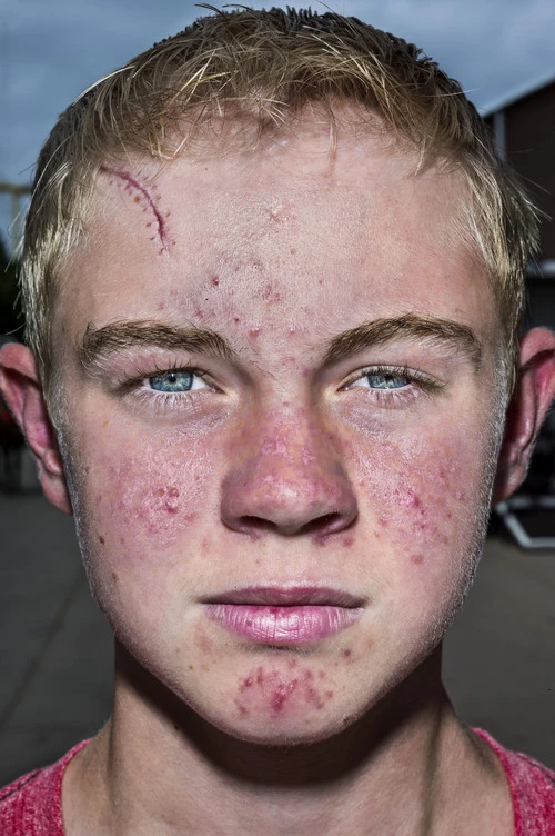 그의 연작 'FACES' 중 세 장의 사진이 이번 전시회에 소개되었다. 이 사진은 그중 하나고, 수위가 제일 약한 사진이지만 여드름이 채 지워지지 않은 소년의 얼굴에는 여느 소년들에게서 찾아볼 수 없는 불행이 선명하게 각인되어 있다. 다른 사진들 역시 온갖 상처가 담긴 얼굴을 극도로 가까이에서 찍은 것으로, 그 자체로 충격적이었다. 세 장의 사진만으로 세상의 모든 불행을 모아놓은 것 같았다. 무표정한 인물들의 얼굴에서는 고통에 이미 무뎌질 대로 무뎌져 버린 그들의 삶이 보였다. 그들의 상처에 대해 더 자세히 알고 싶어 사진에 가까이 다가갔다. 하지만 사진을 자세히 보면 볼수록 그들의 불행이 주는 충격은 생동감을 잃었다. 상처는 작위적으로 느껴지기도 했고, 그들의 무표정에서 나오는 무감각은 인위적으로 느껴졌다. 그렇게 나는 다른 사진들로 발걸음을 옮겼다.