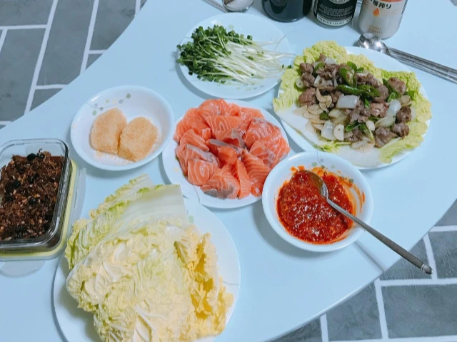 수분 가득한 배추쌈과 함께 연어가 입에서 사르르 녹는다. 오도독오도독 터지는 날치알을 느낄 때쯤, 고추장 멸치 볶음이 연어의 느끼한 맛을 잡아준다. 나에게는 다소 새로운 이 조합이 너무나도 환상적이다. 이런 연어 쌈이라면 한 상 가득 올려진 연어들을 다 해치울 수 있을 것만 같다.