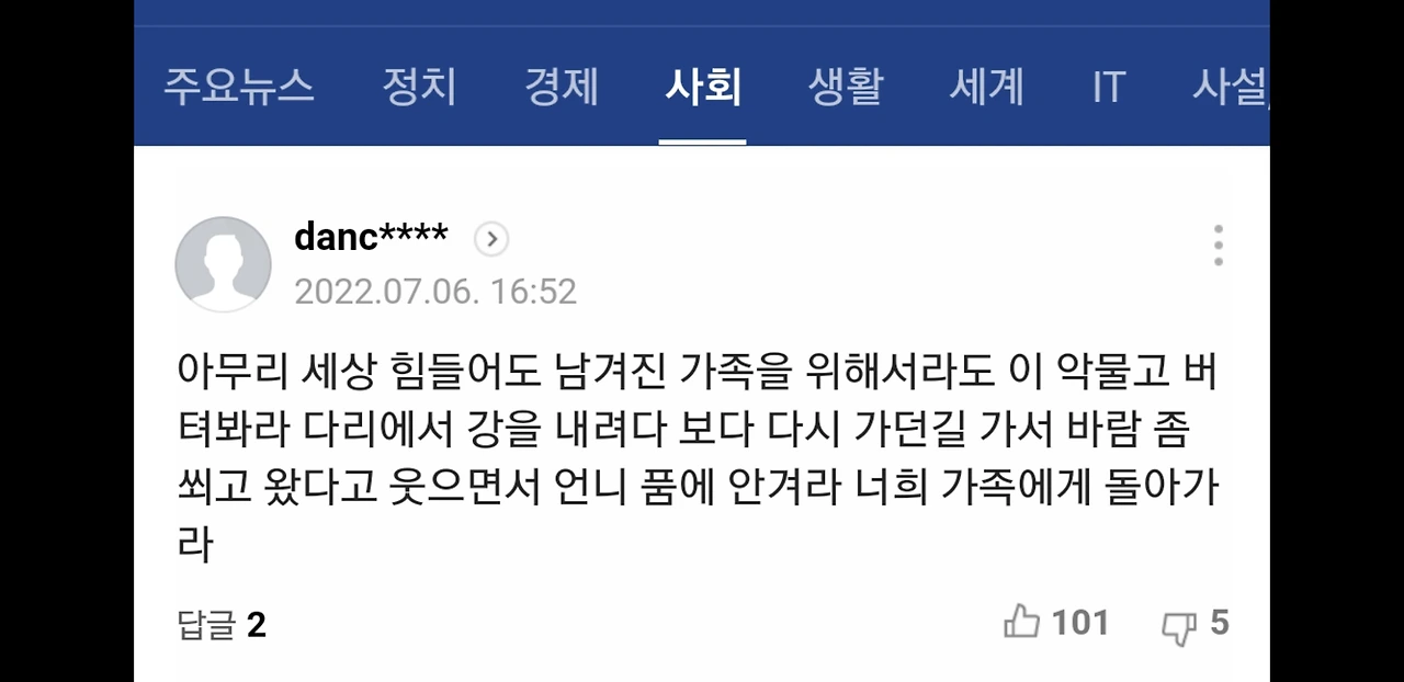 아무리 세상 힘들어도 남겨진 가족을 위해서라도 이 악물고 버텨봐라 다리에서 강을 내려다 보다 다시 가던 길 가서 바람 좀 쐬고 왔다고 웃으면서 언니 품에 안겨라 너희 가족에게 돌아가라