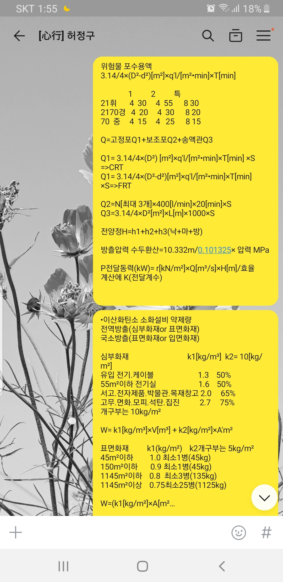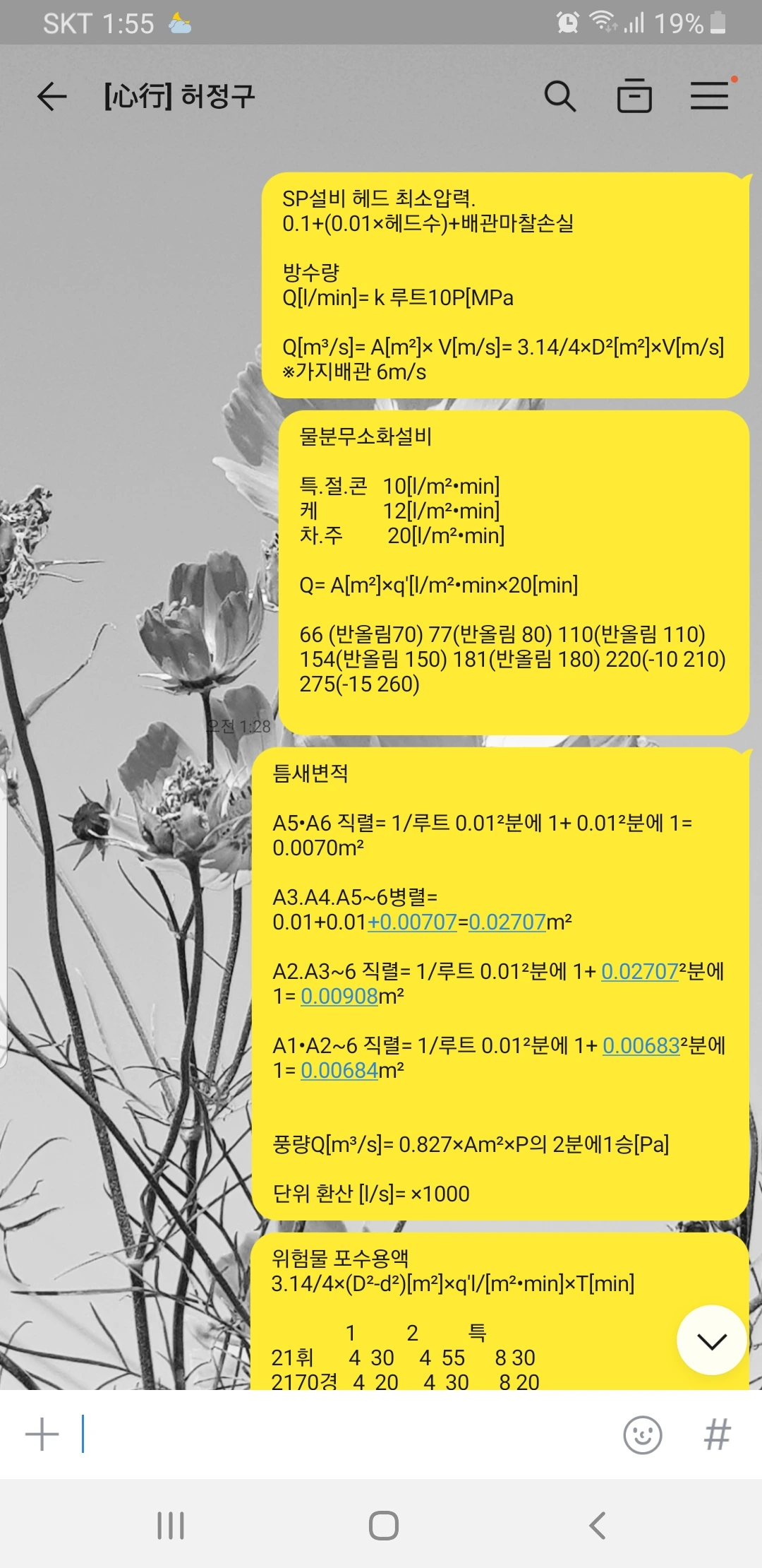 올해는 소방기계설비기사를 시작했다. 필기는 첫 1회 시험에 무난하게 통과했지만 문제는 실기였다. 생소한 단어와 공식과 수치들... 유체역학을 넘기도 어려운데 각종 소방설비들은 제각각의 기준들을 가지고 시설되기에 각 설비의 설치 기준들을 이해하여야 했다. 두 번의 시험을 그냥 지나 보내는 중에 같이 시작했던 직원 중 과장은 소방설비 전기를 합격하고 어느 날 소방설비기계를 준비한다는 말에 나는 다시 기운을 얻어 시작하였다.
