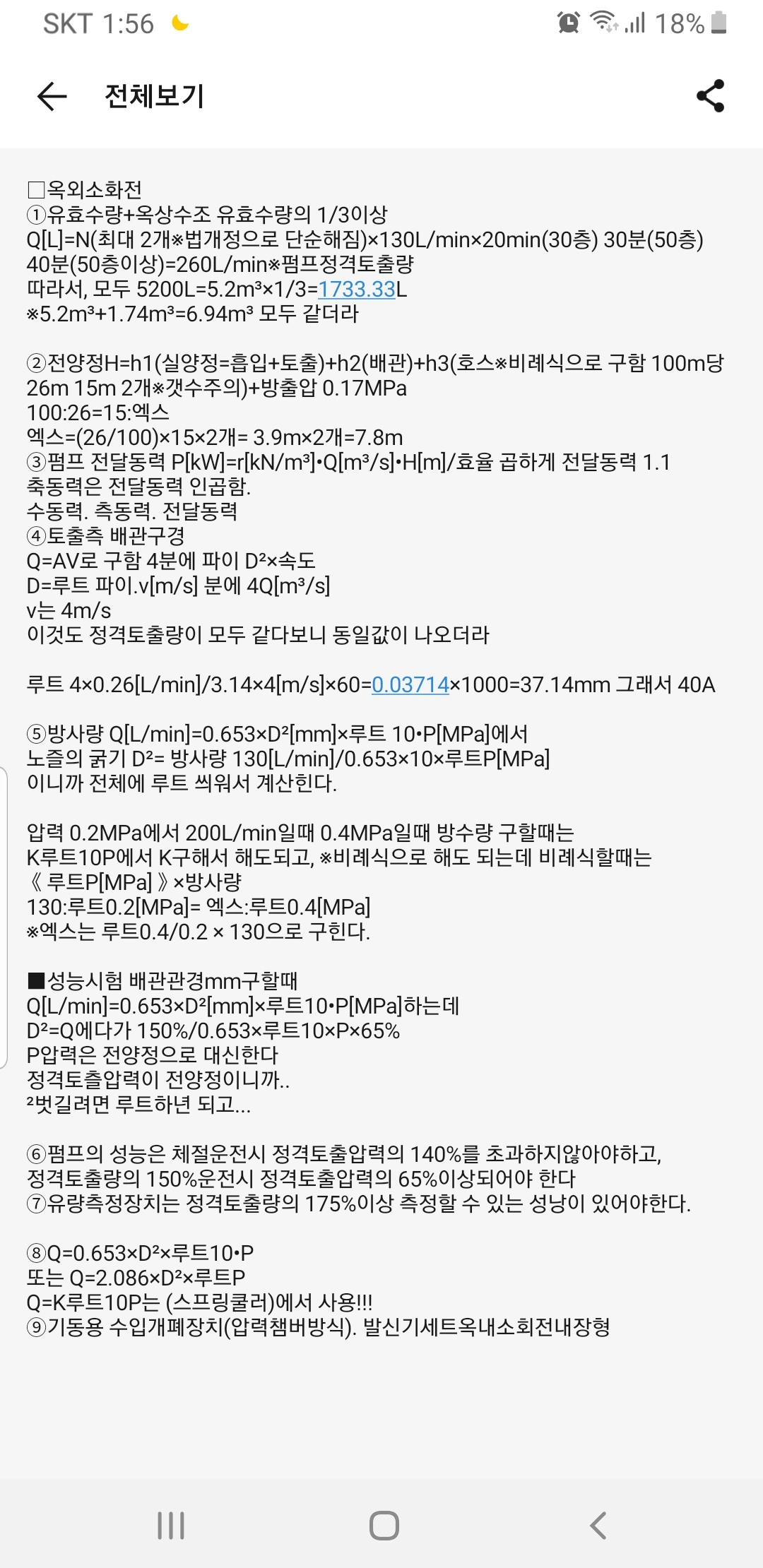 SP 설비의 헤드 간격과 소방대상물에 따른 SP 기준 개수에 이에 맞는 펌프의 동력을 이해했다.