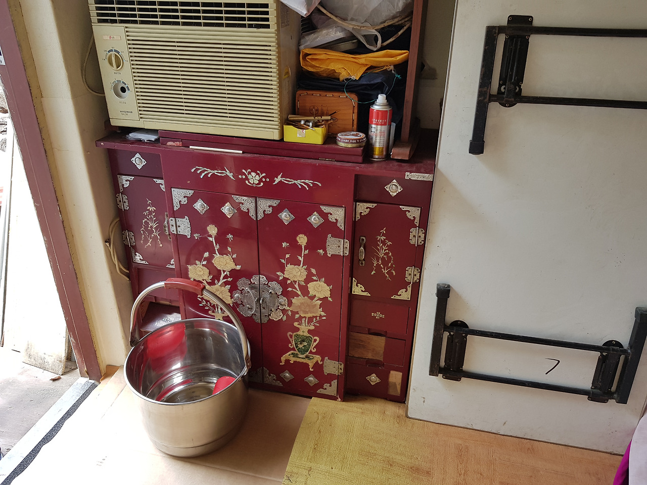 오래된 옷장과 층층이 쌓여있는 물건들. 그리고 빨간 자개장식의 재봉틀.