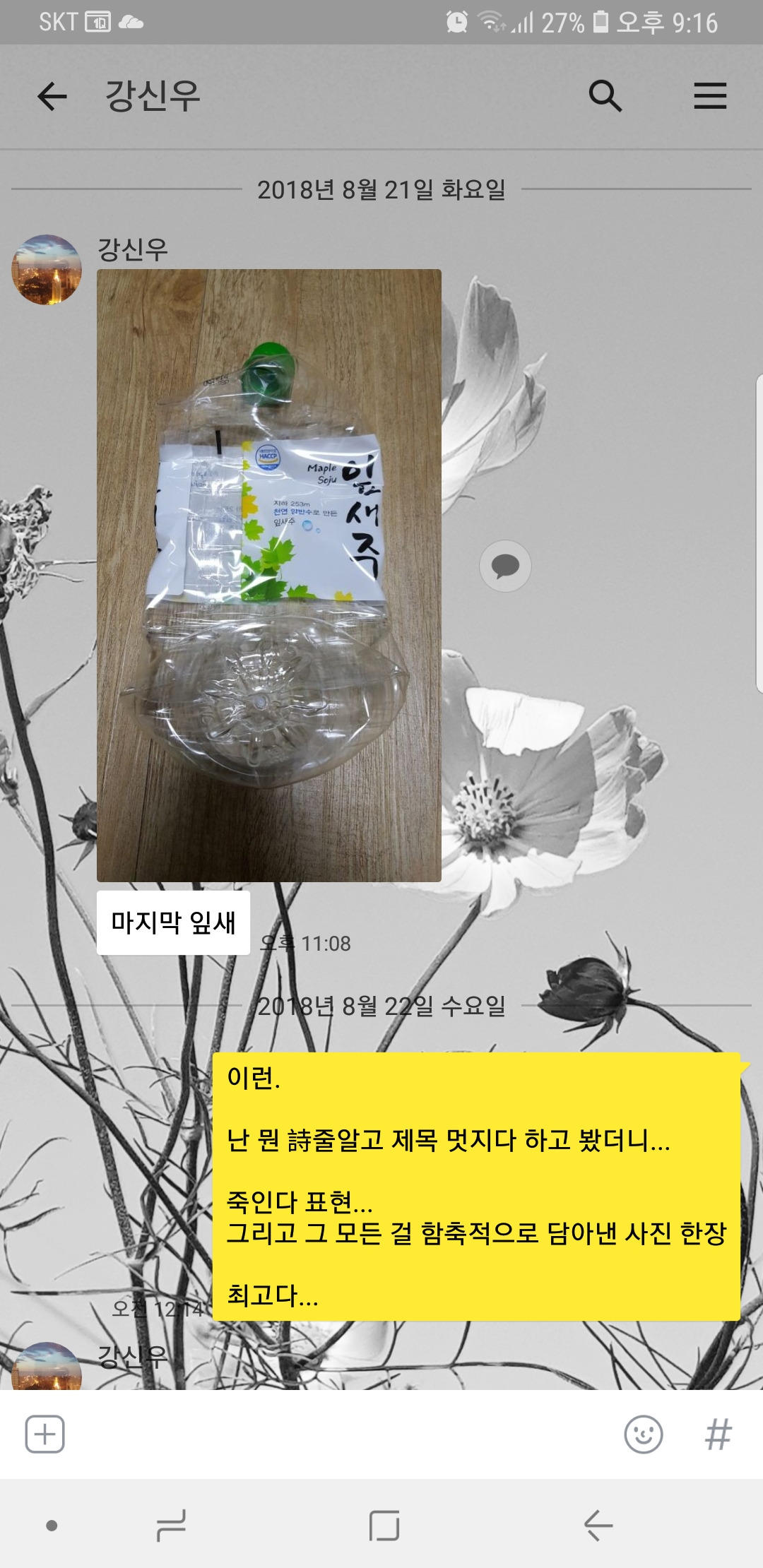 "마지막 잎새"란 표현으로 카톡을 보냈다.