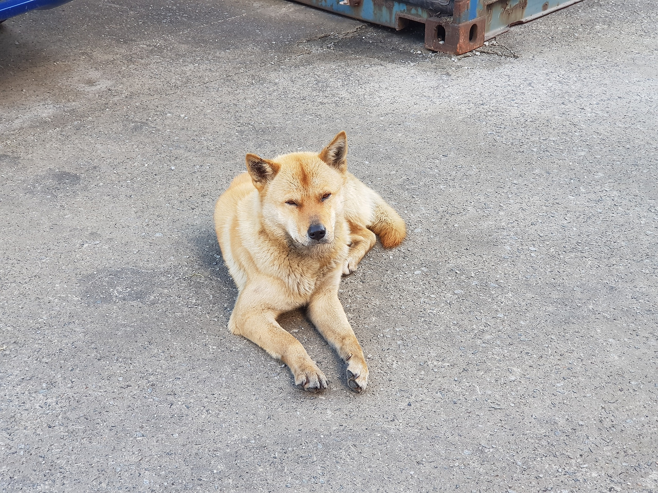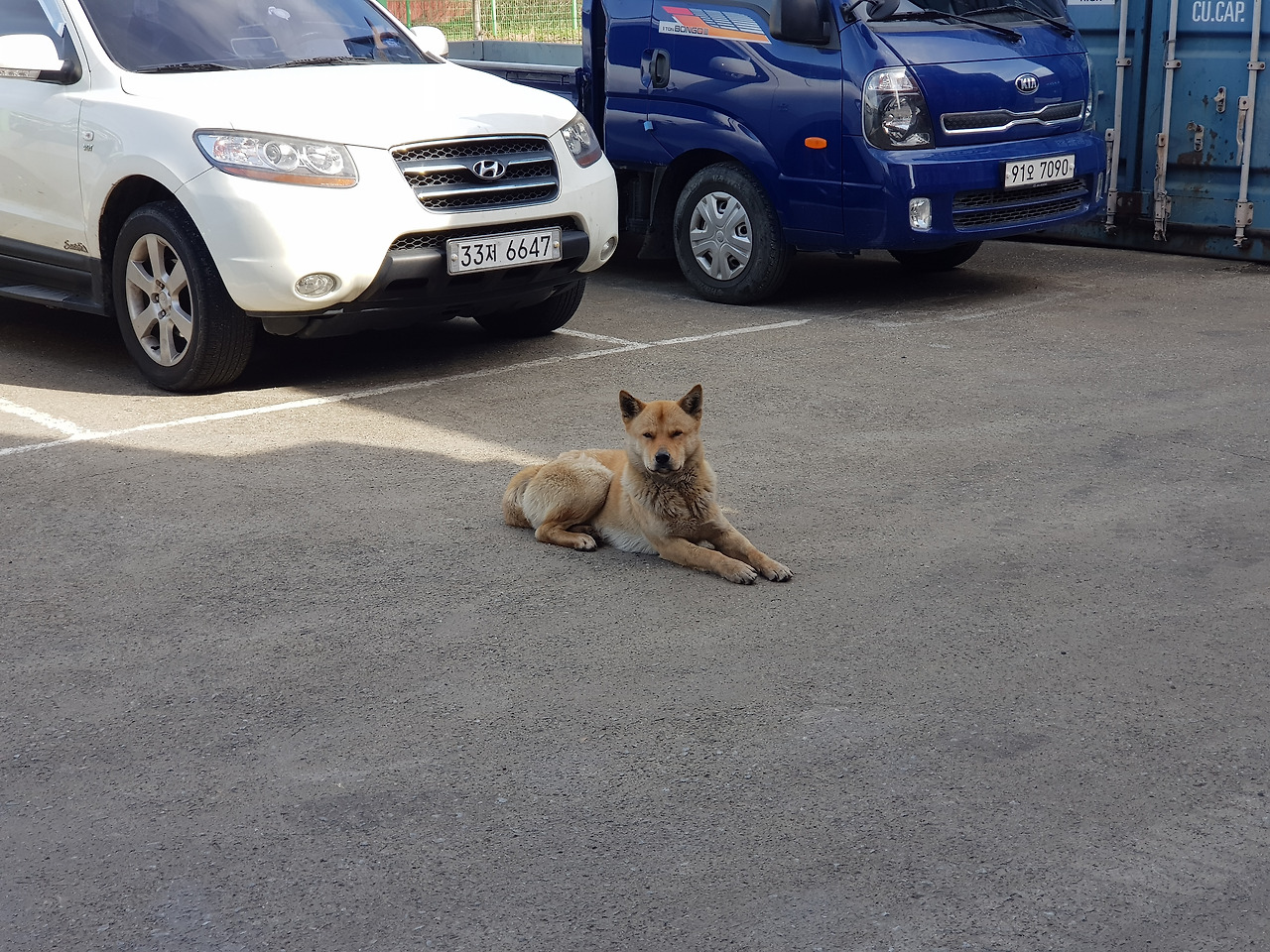 사무실 앞 주차장에 얌전히 다소곳이 앉아 있는 개를 보곤 또 왔다고... 한 마디씩 했다.