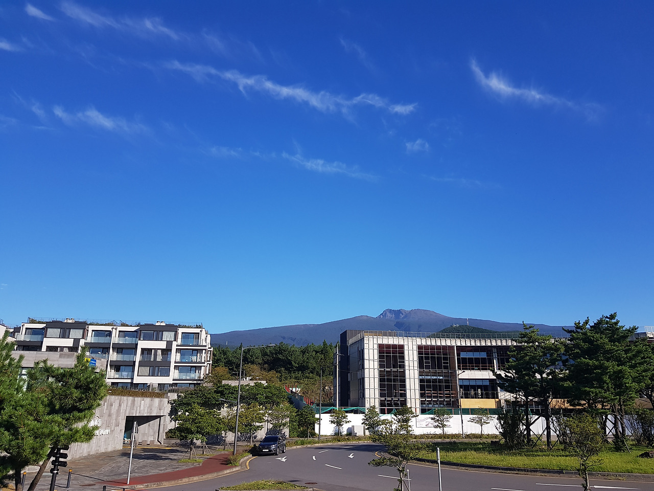 저 앞에는 서귀포의 바다가 보이고 저 뒤에는 한라산 정상 백록담에 구름이 걸렸다가 넘어간다.